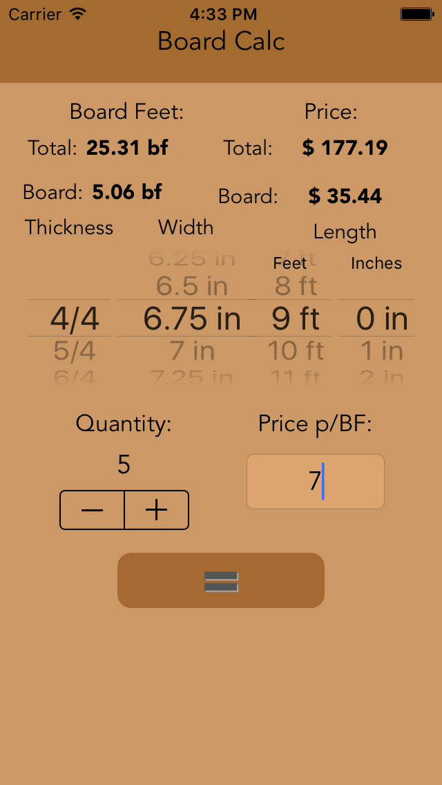Board Calc is a simple, easy to use board foot calculator for woodworkers. It allows you to quickly drag the scroll wheels to enter the dimensions of a board, the price per board foot and then hit the equals button to calculate the total board feet and the purchase price (before taxes). If you have more than one board of the same dimensions, you can adjust the quantity and hit the equals button to update your totals for the specified quantity.