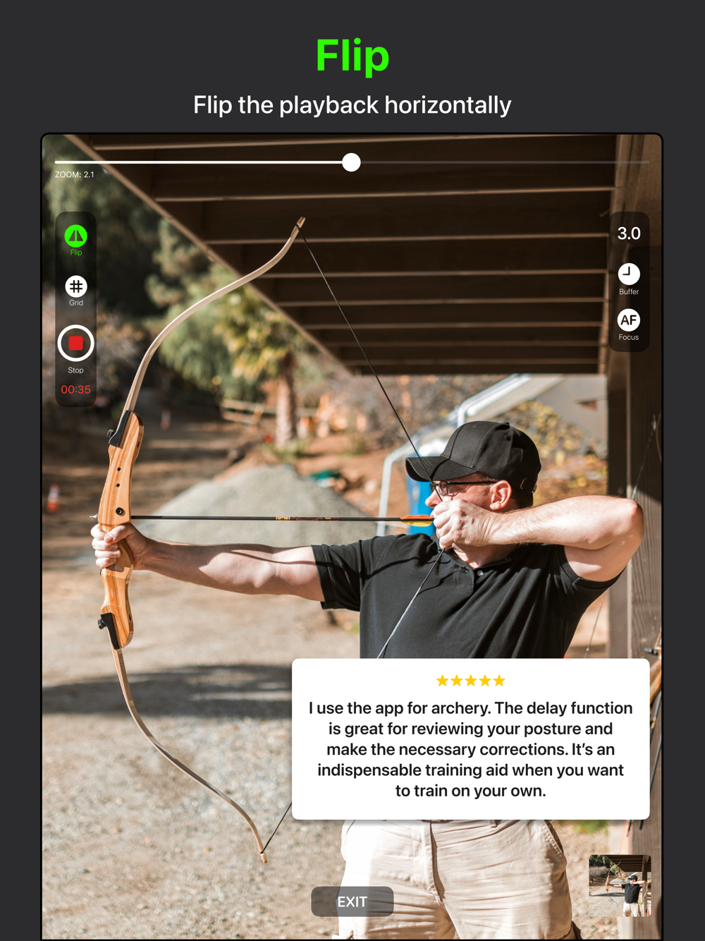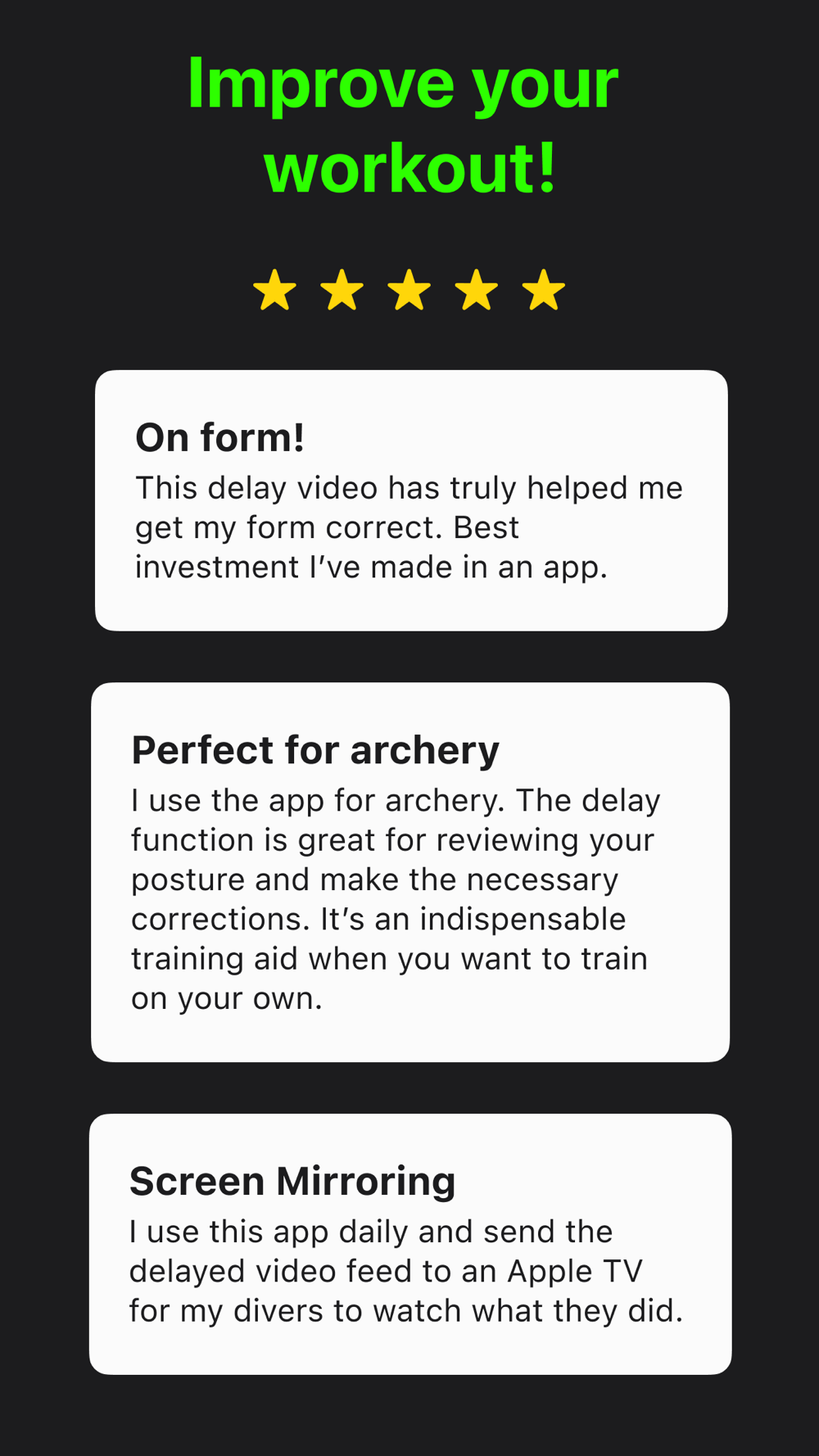 Frustrated by making the same mistakes and wasting time on your workouts? Turn your iPhone or iPad into the mirror, showing continuous delayed playback. Receive instant feedback, analyze your form in slow motion, build good muscle memory, and get faster results. No more stopping your exercise & watching recorded videos. Review your movements immediately, correct your posture, and return to the action.