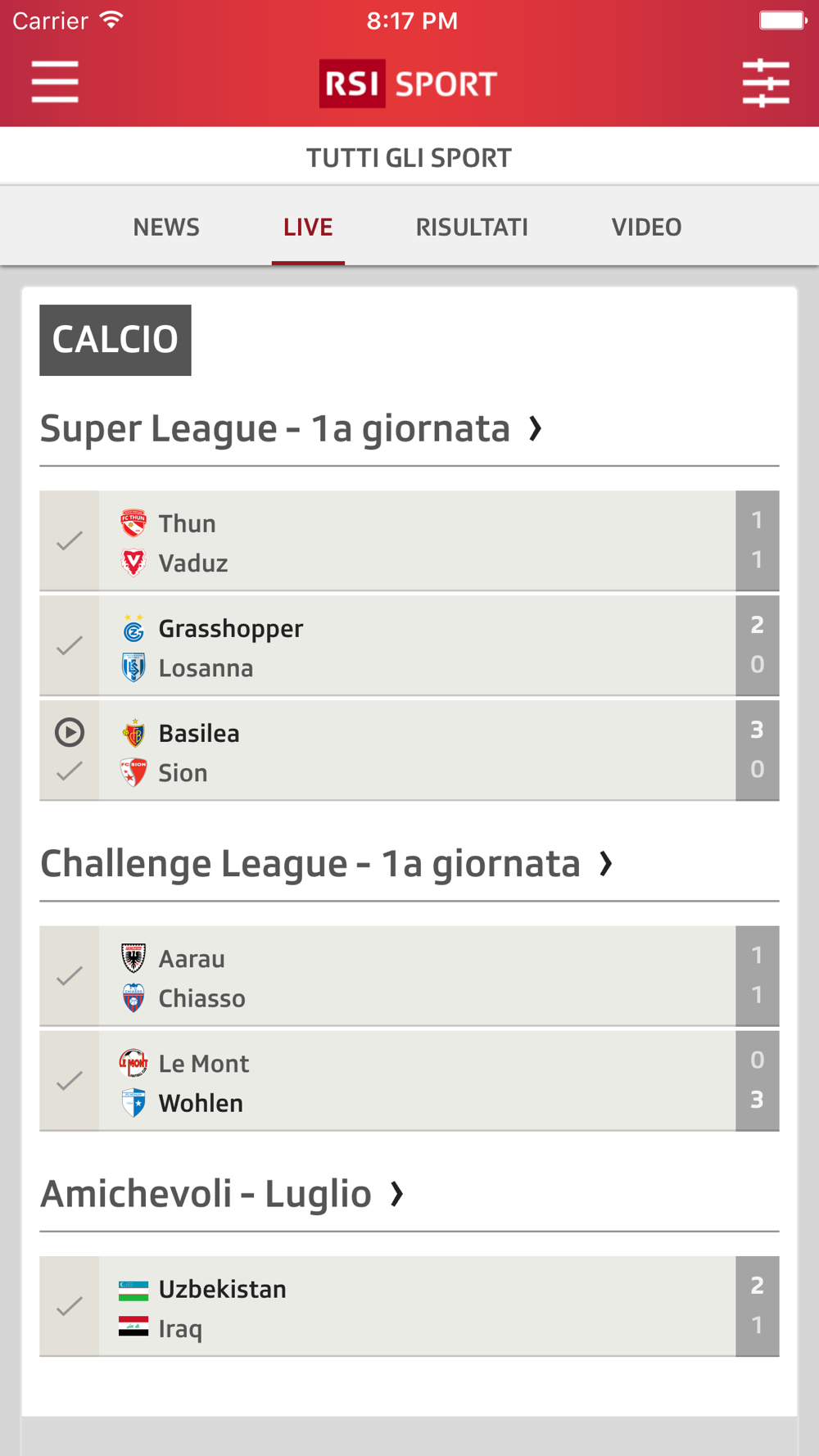 - Risultati in diretta dei campionati nazionali e internazionali più seguiti in Svizzera