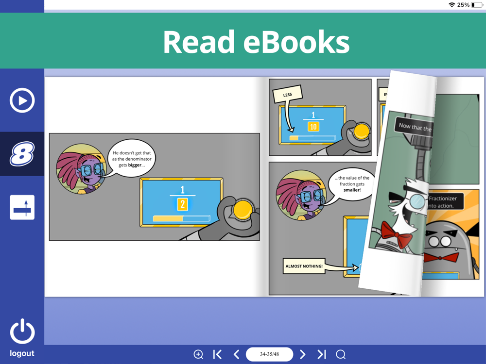Learning videos and eBooks on this app feature engaging math superheroes. In each story, the heroes use their math powers to trick the evil Professor Possum and save their planet. Each character represents a math practice standards (e.g. “Use Evidence”, “Be Persistent”) to help students become stronger mathematicians.