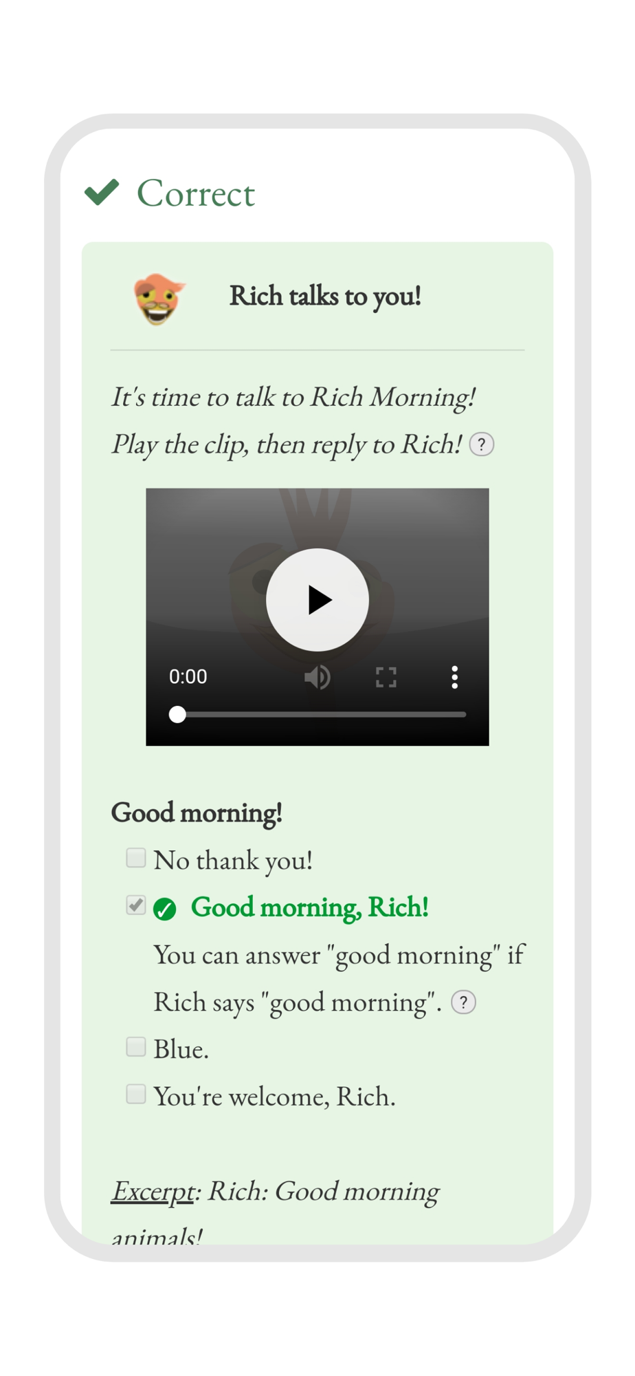 The Rich Morning Show provides daily personalized English lessons for beginners. Each morning, you receive a daily lesson featuring a video followed by questions, corrections, mini-lessons, and personalized revision exercises.