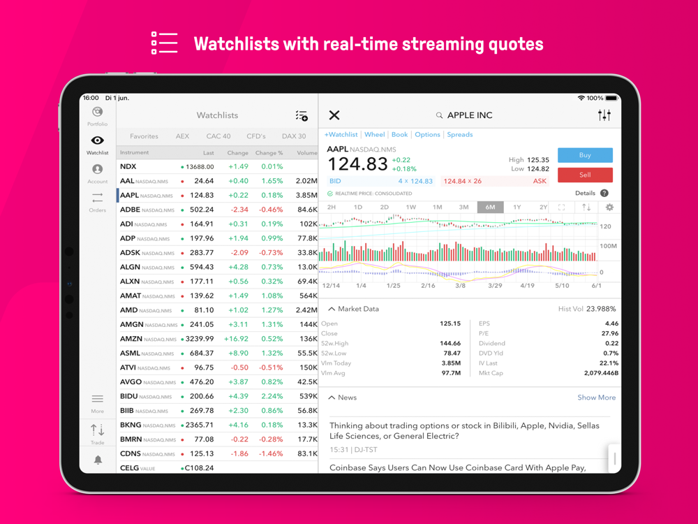 Trade with your mobile and tablet on the app based version of the LYNX Trading Platform. You have access to the stock markets and your personal account at any given moment. Trade in stocks, options, structured products, futures, currencies and more.