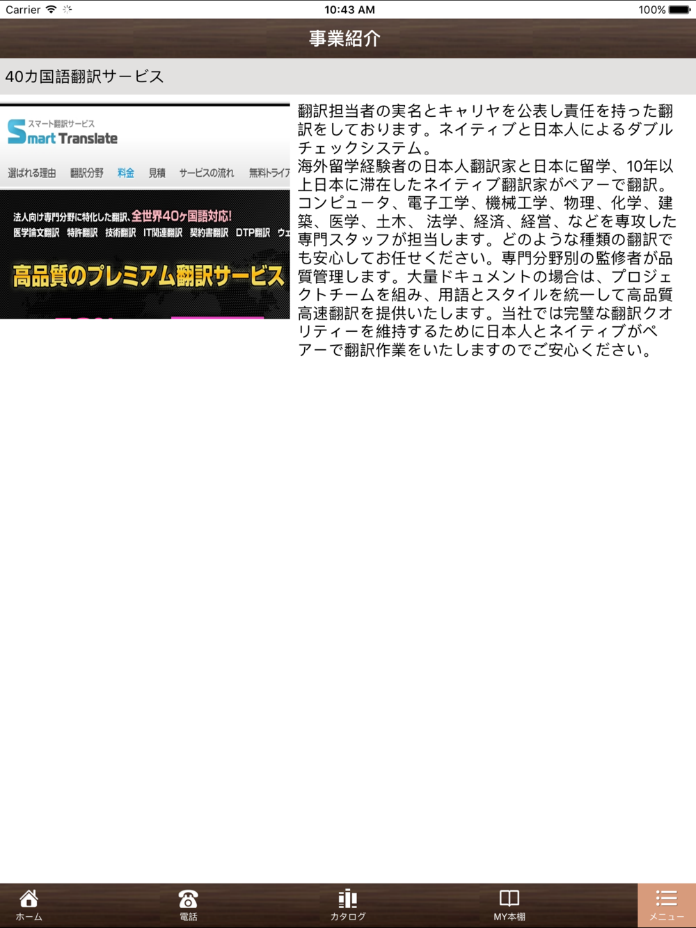 ・事業紹介、サービス内容を管理画面から書き込むとアプリの「事業紹介」のメニューに反映されます。