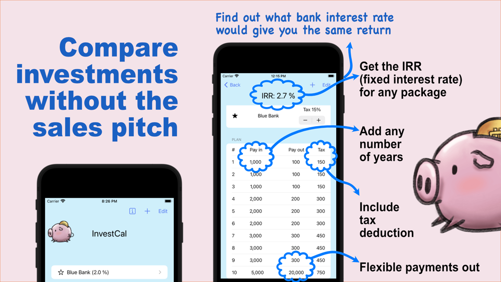 Please note that there are more things that need to be considered than just IRR when making financial decisions. These include the total value of the package, changing inflation, changing bank rates, insurance linked to the package etc etc. All of these can make a big difference to the suitability of any investment. So, use this as a guide only, do not use this app to make final decisions with your money.