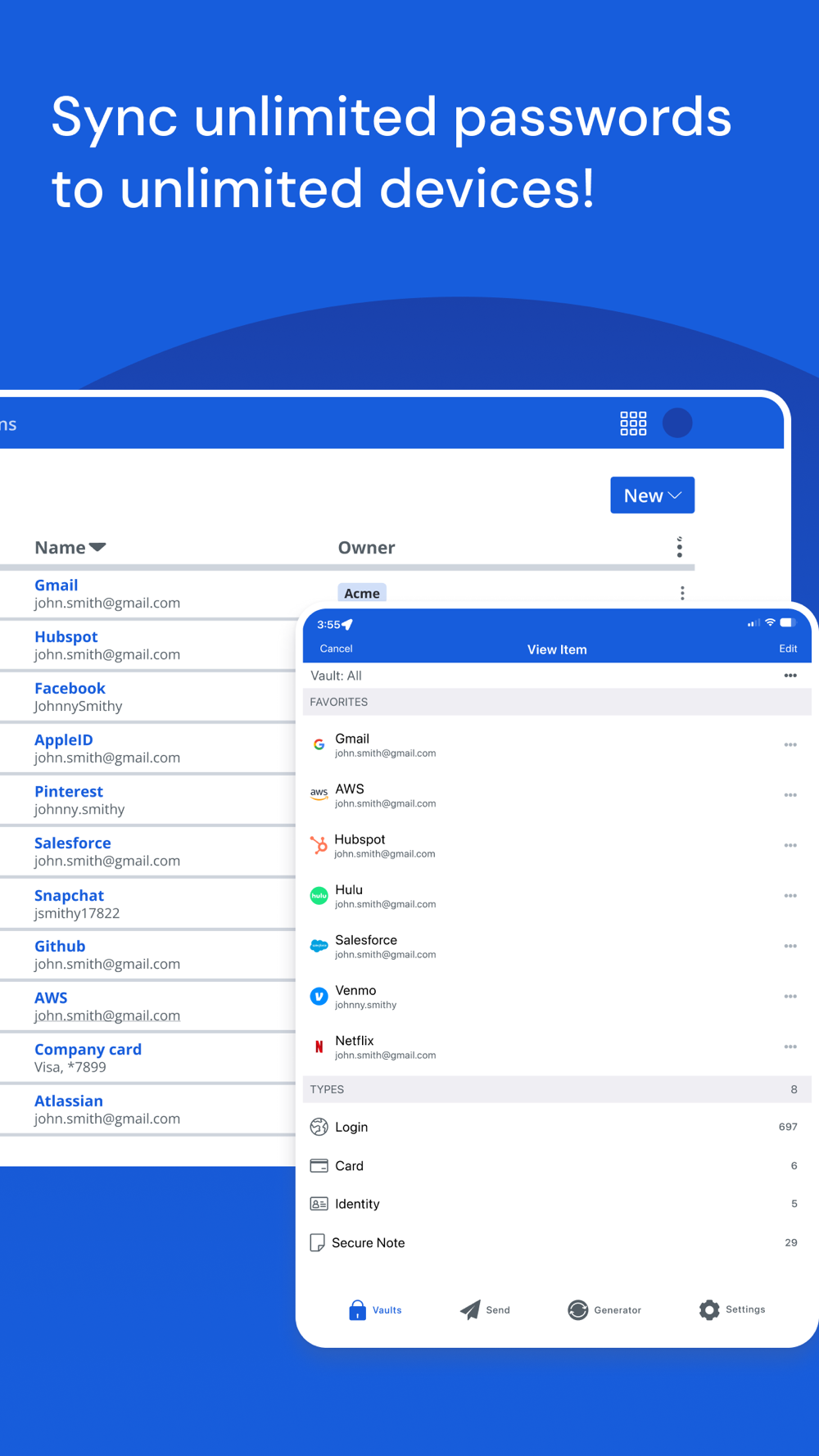 Easily manage, store, secure, and share unlimited passwords across unlimited devices without restrictions.