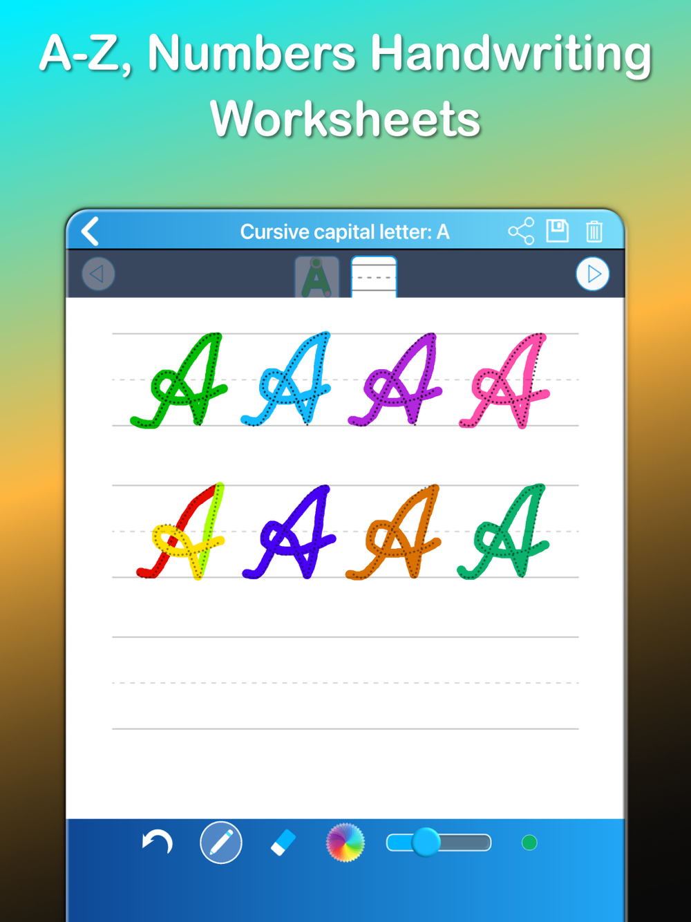Watch the screen come alive as you learn to write letters from A to Z and numbers from 1 to 20. You can use your finger or a apple pencil to draw the letters.