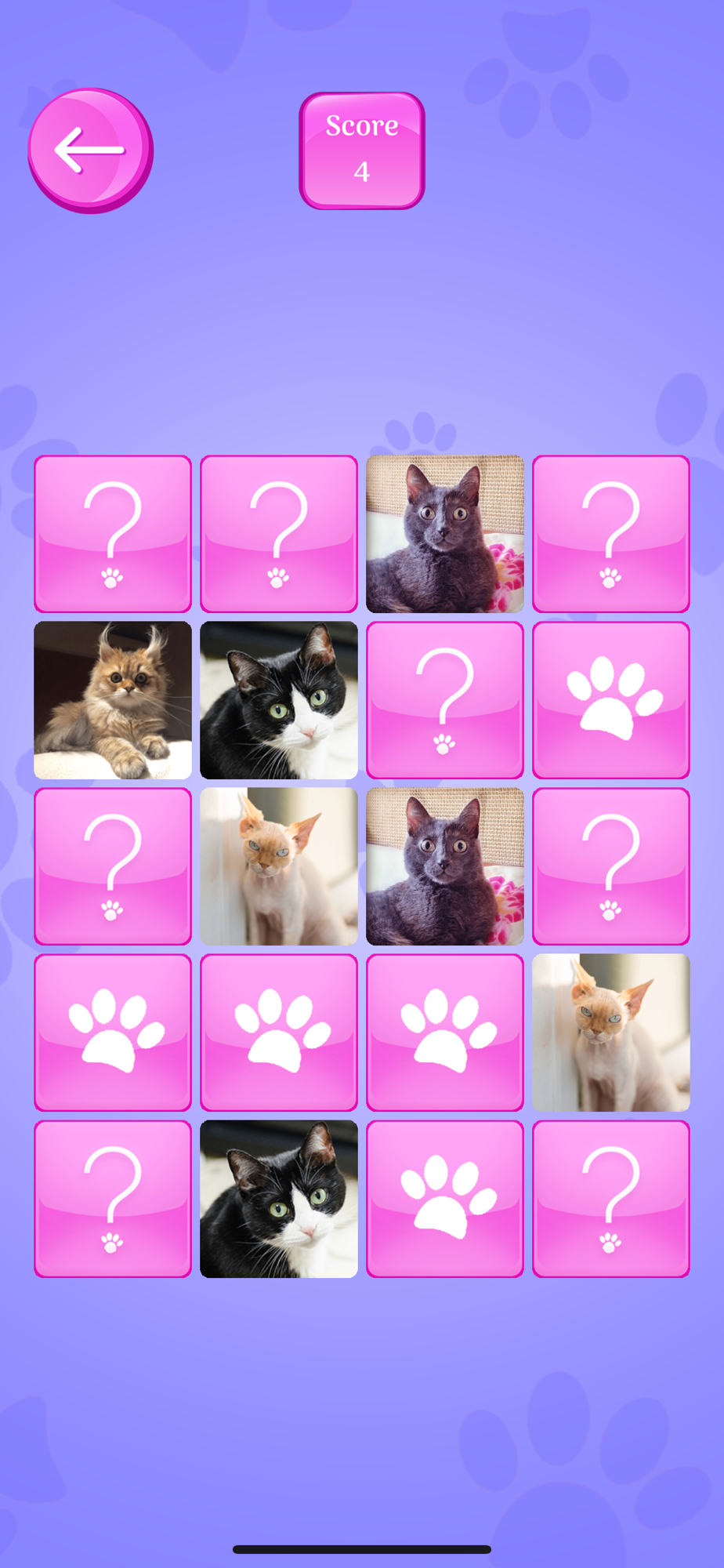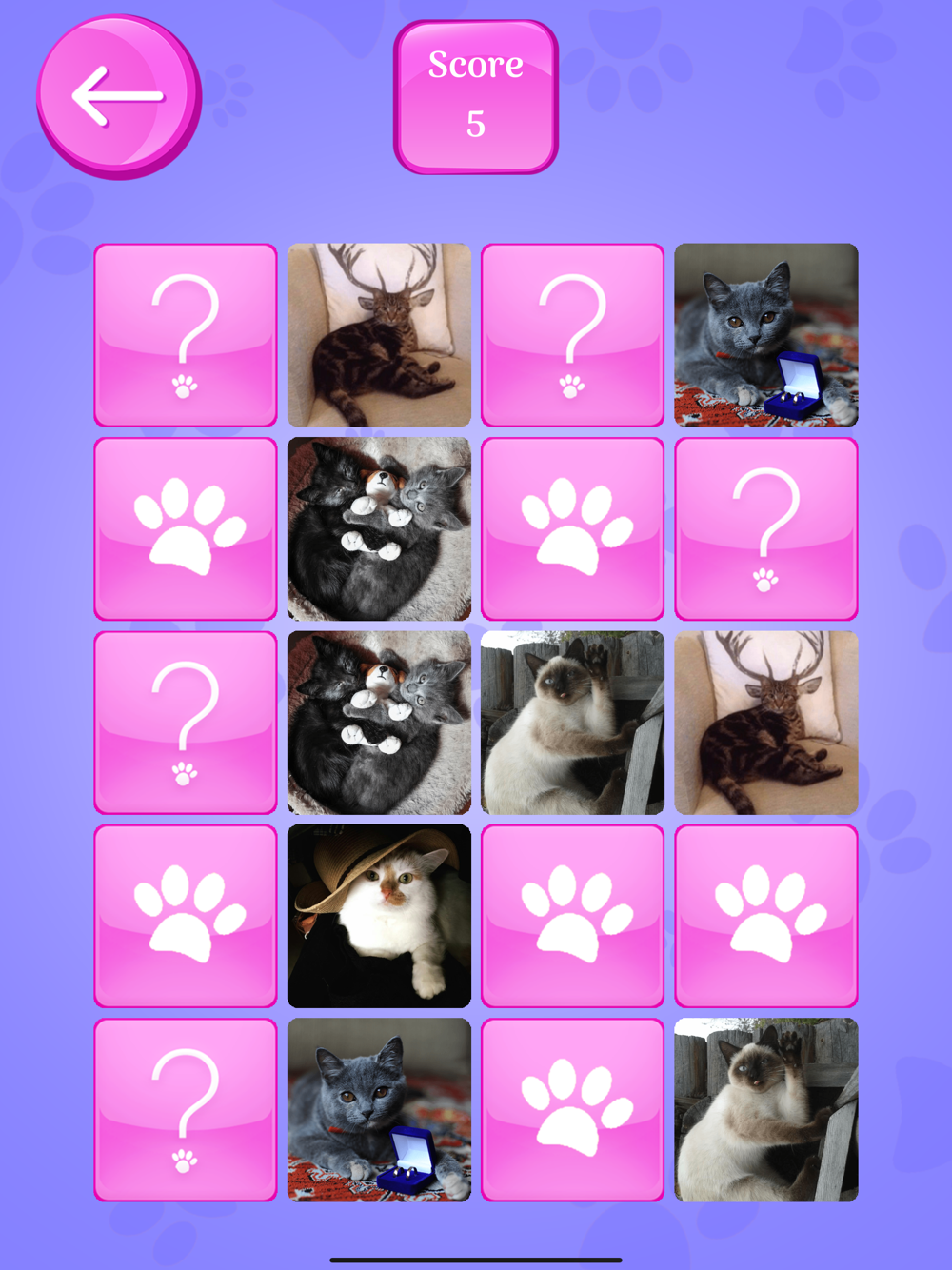 Every time you start a new game, a random selection of the cards ensures all different games, so you can replay endlessly. Turn 2 cards over by tapping them. If cat cards match, they will stay there, if do not match, they will flip back over.