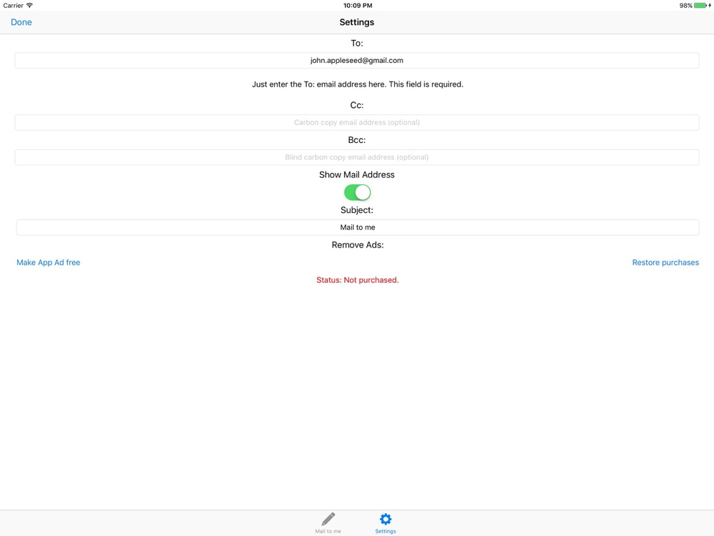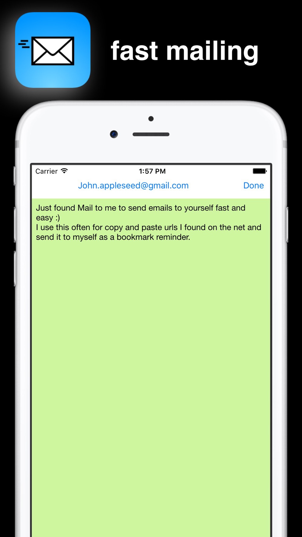 *** Do you mail to yourself a lot? Then this App is for you. Just setup your email once and start mailing to yourself fast and easy.