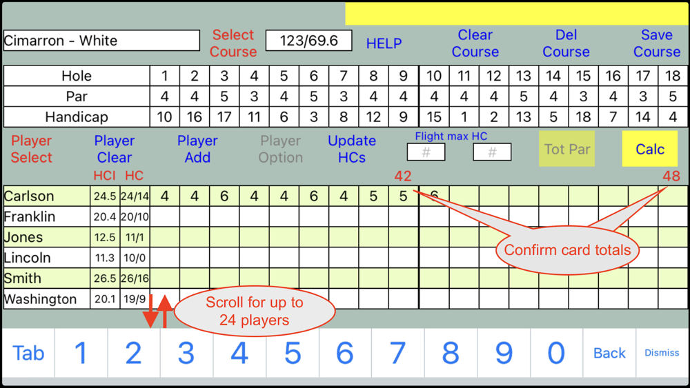 Enter and save "usually played" course and "usual" player data. Then simply select your course and players from the pull down menus, add any guests, enter scores, define any "flights", and press CALC, VOILA !. Even take a photo or send an email of the game.