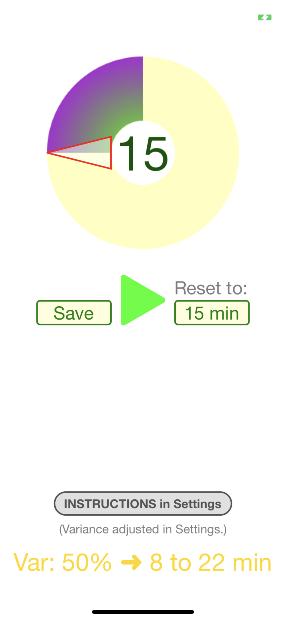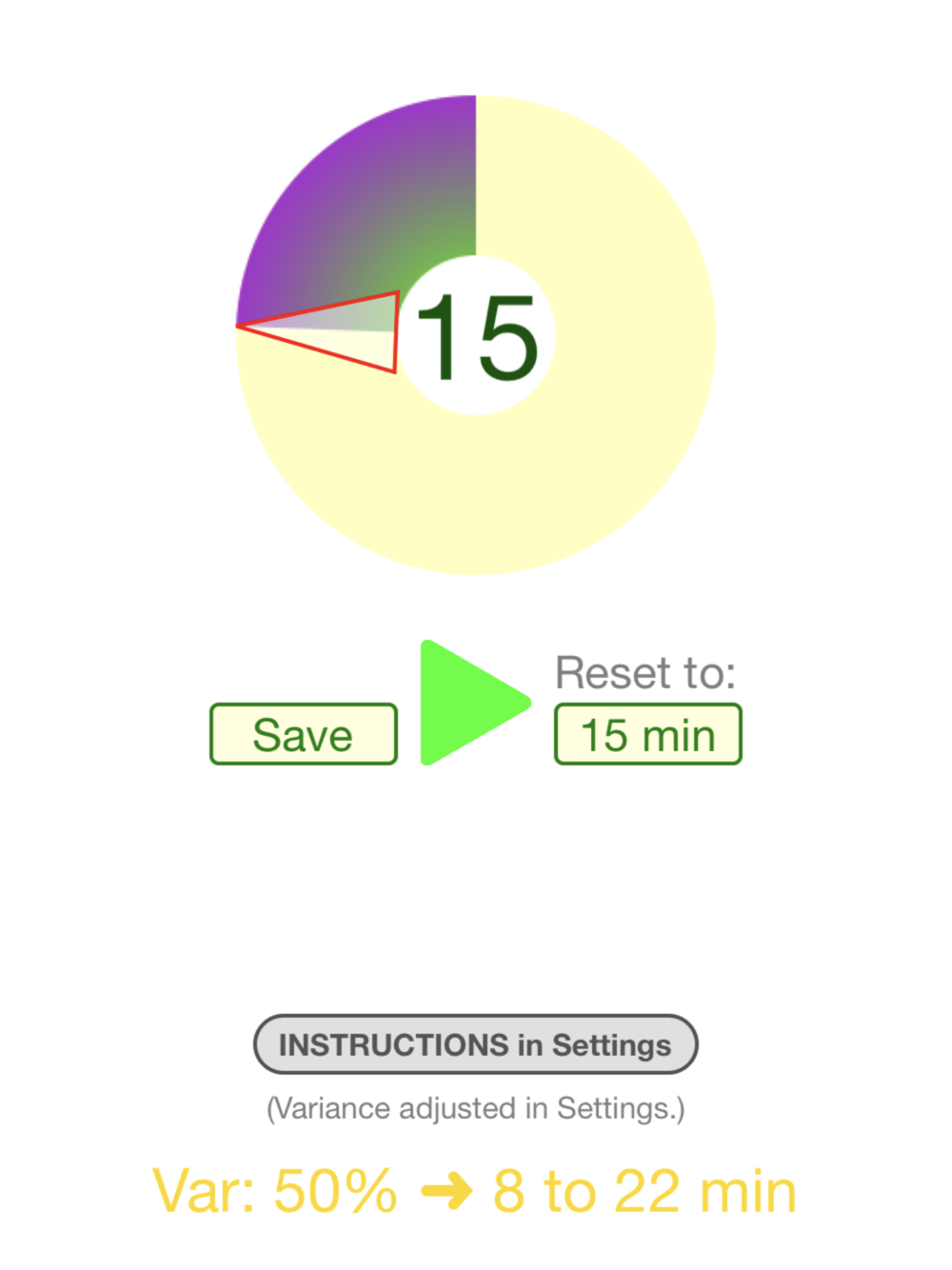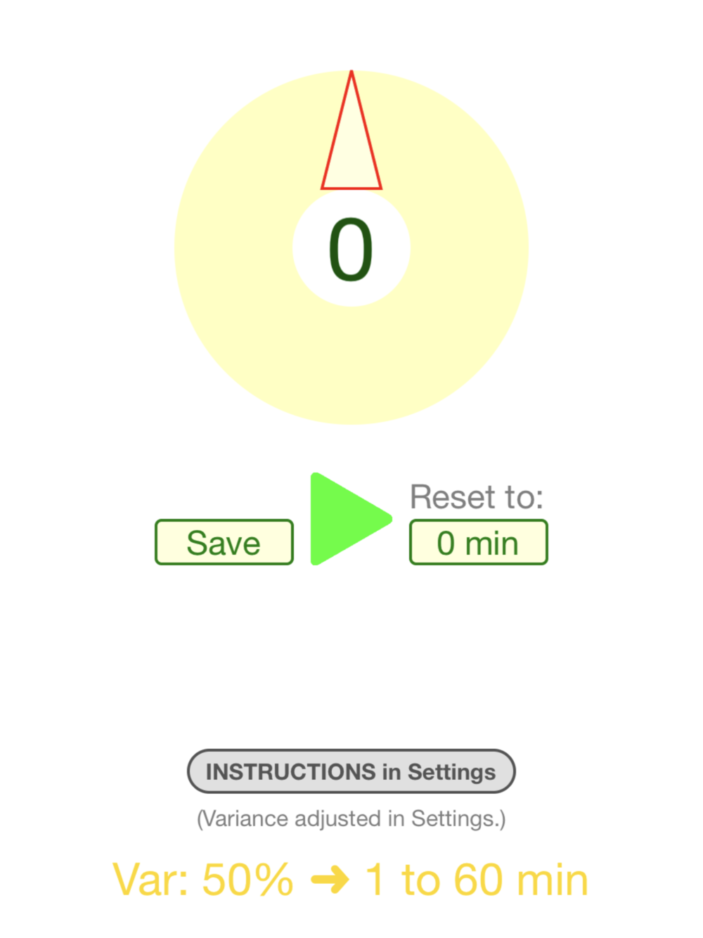 There is a message displayed at the bottom of the screen that describes what the variance calculation will be, given the settings that you have chosen; for example, if you set the timer for 30 minutes, and the variance to 50%, then the message will say, “Var: 50% = 15 to 45 min.” That means that when you start the timer, the arrow will jump to a point between 15 and 45 minutes before it begins to count down. (You can choose to hide that message.)