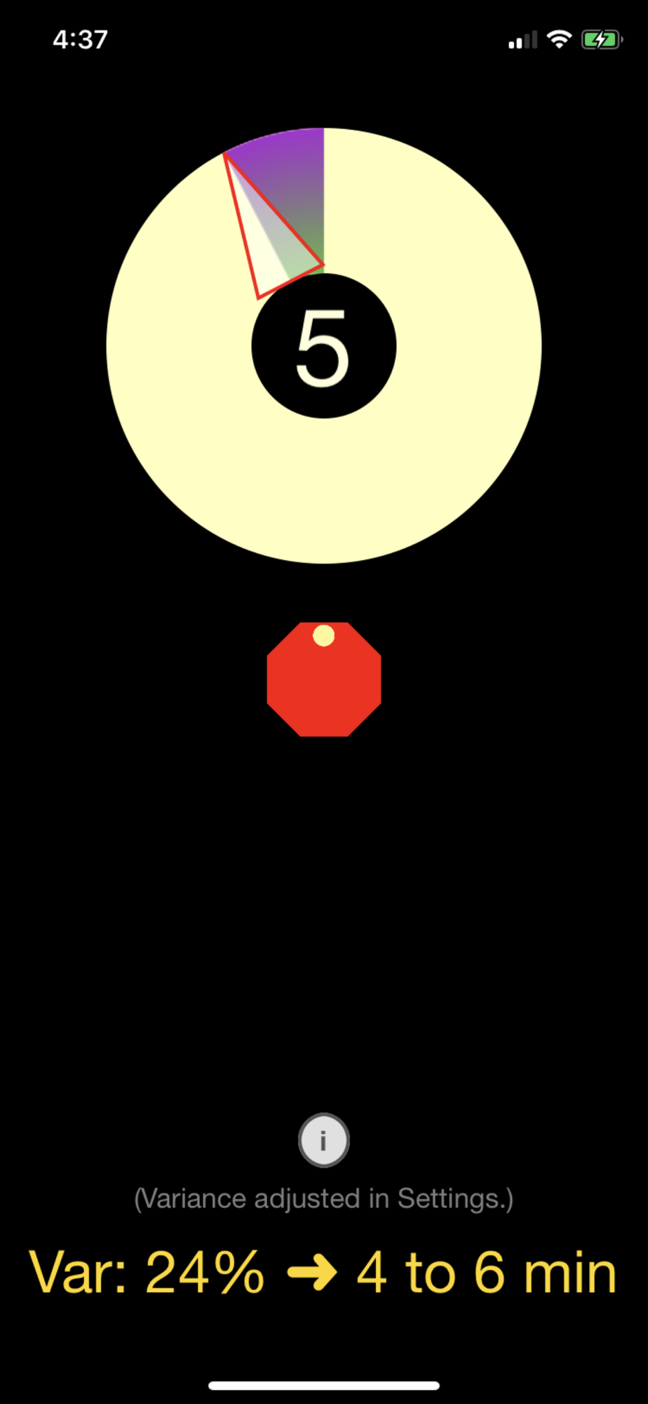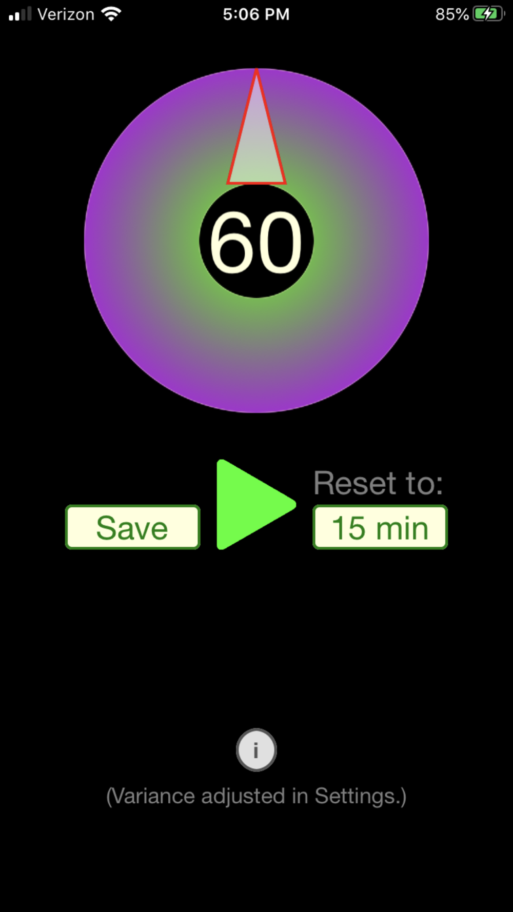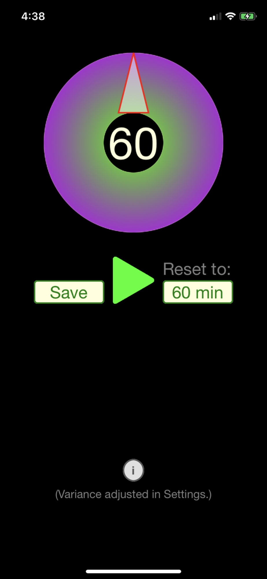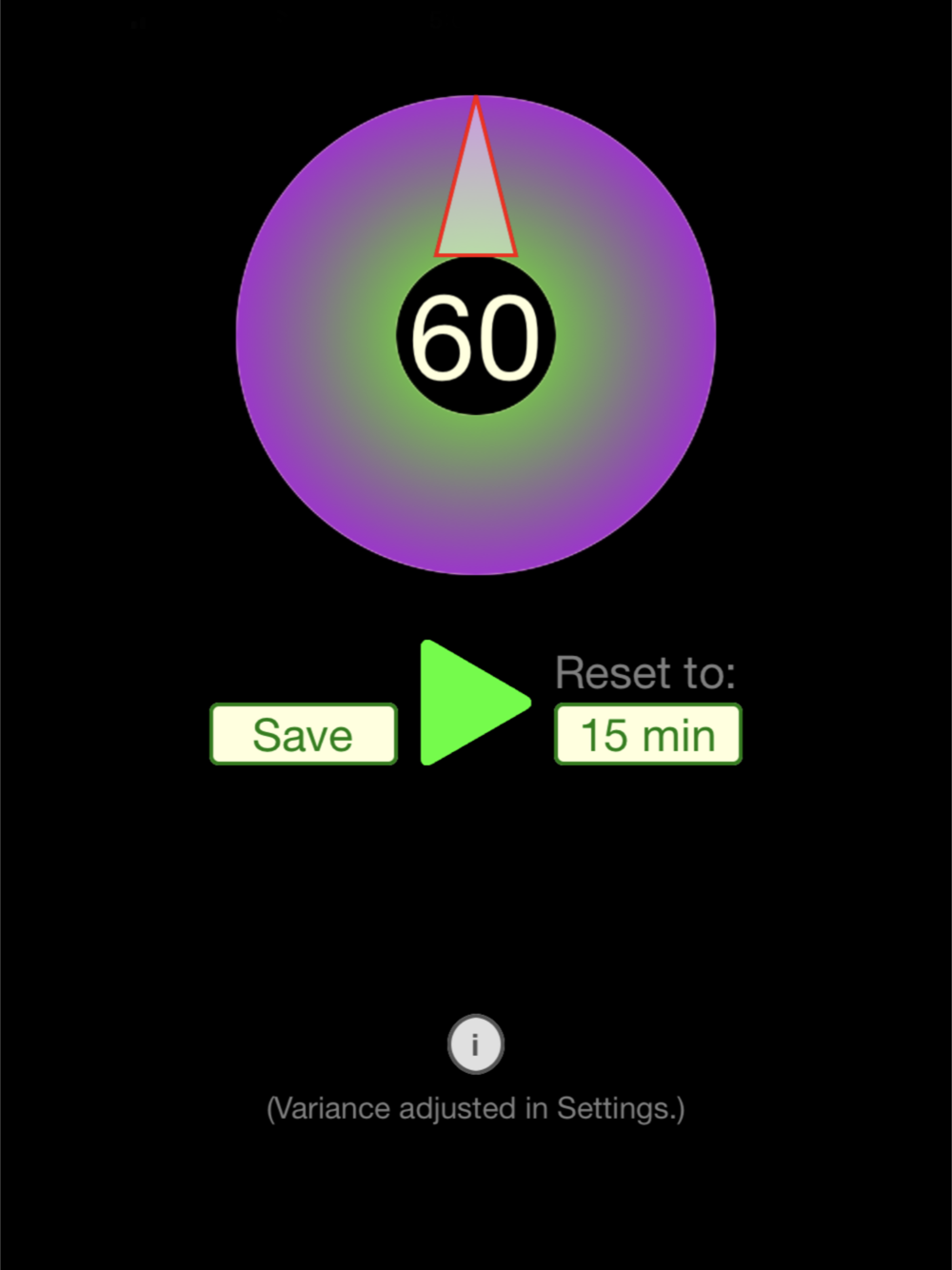 Tap the green Start arrow to begin the countdown and display the Stop button (i.e., the red stop sign). If no variance is set, the arrow will immediately start to move as the time decreases (in intervals of one second). If a variance amount is set, then the arrow will jump to a (constrained) random starting point before counting down. When the timer is done counting down, up to three types of alarms will go off (depending on your Settings). All alarms will cease when you tap the Stop button (which in turn displays the Start button, as well as the Save/Reset buttons).