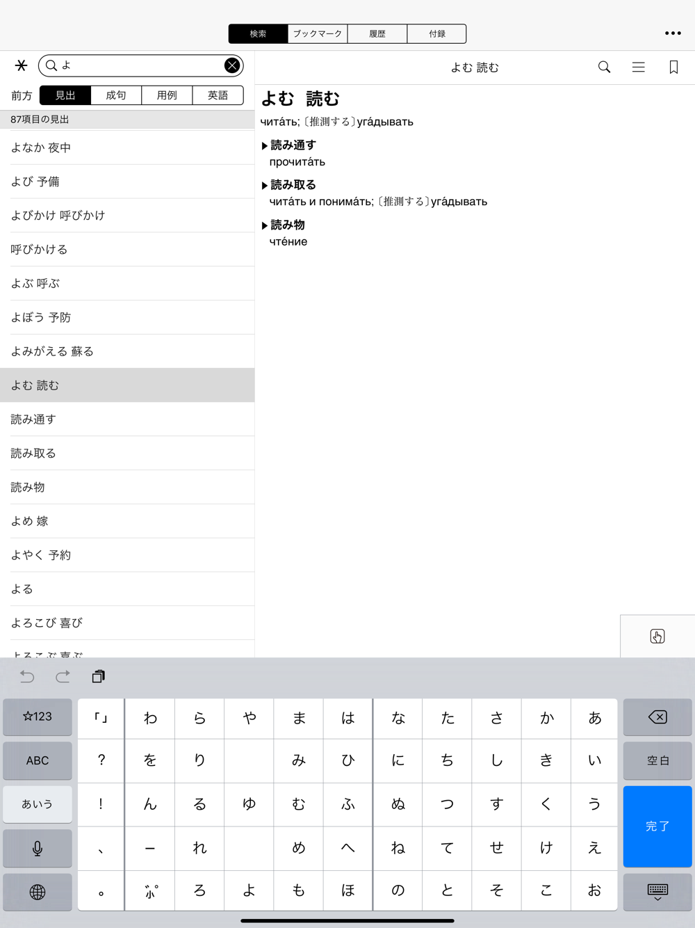 物書堂の他の辞書アプリと同様に、「なぞってジャンプ®」や日本語での用例検索など便利な機能を搭載しています。またブックマークや履歴機能など辞典アプリの基本的な機能も充実しています。
