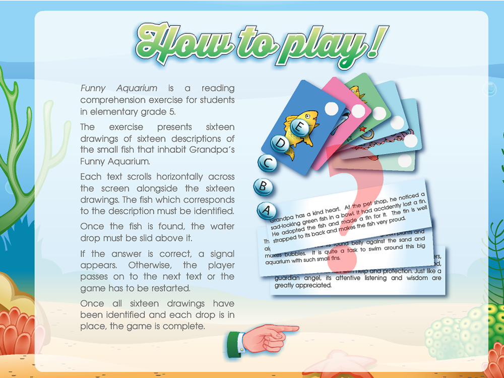 The exercise presents sixteen drawings of sixteen descriptions of the small fish that inhabit Grandpa’s funny aquarium. Each text scrolls horizontally across the screen alongside the sixteen drawings. The fish which corresponds to the description must be identified. Once the fish is found, the water drop must be slid above it. If the answer is correct, a signal appears. Otherwise, the player passes on to the next text or the game has to be restarted. Once all sixteen drawings have been identified and each drop is in place, the game is complete.