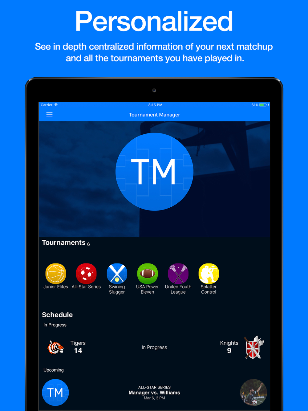 * View tournaments you are playing in, and view your upcoming scheduled matchups in your user profile