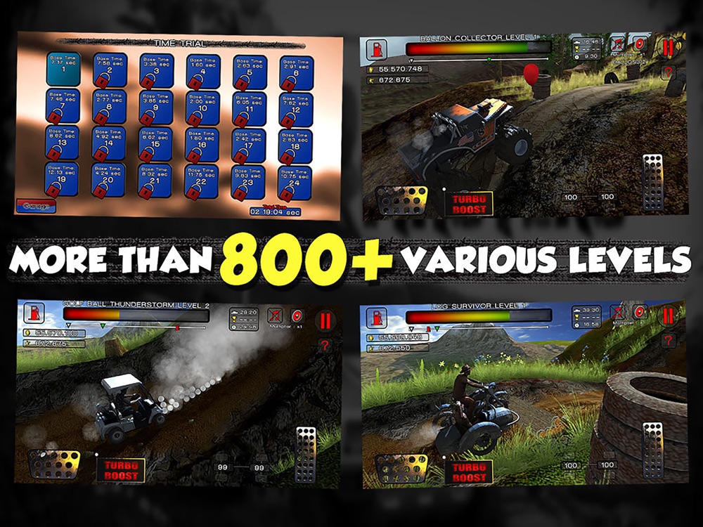 - 16 different game modes: Hill Climb, Fuel Madness, Gentle Push, Time Trial, Football, Balloon Collector, Volcano Eruption, Rocket Hunter, Pack Delivery, Mine Field, Log Survivor, Balloon Finder, Golf Ball Thunderstorm, Time Chaser, Ring Hunter and Butterfly Catch