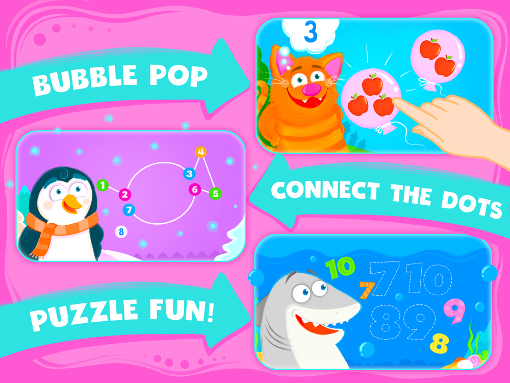 Follow Sully Shark, Ralphie Cat, and Chill E. Penguin out of the aquarium, across the backyard, and all the way to Antarctica as you complete counting, sequence, and number challenges to unlock over 30 interactive prizes!