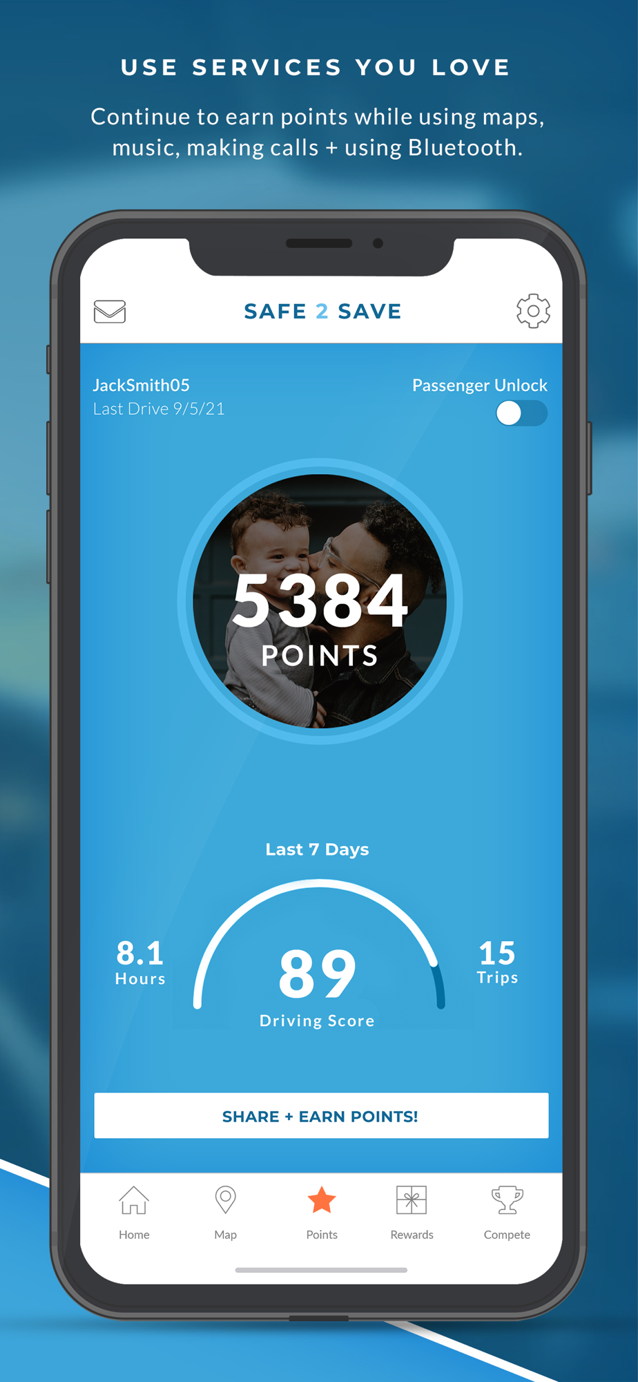 1) Open SAFE 2 SAVE each time you start driving to earn points (or activate the Auto-On feature so that it will open automatically as you drive).