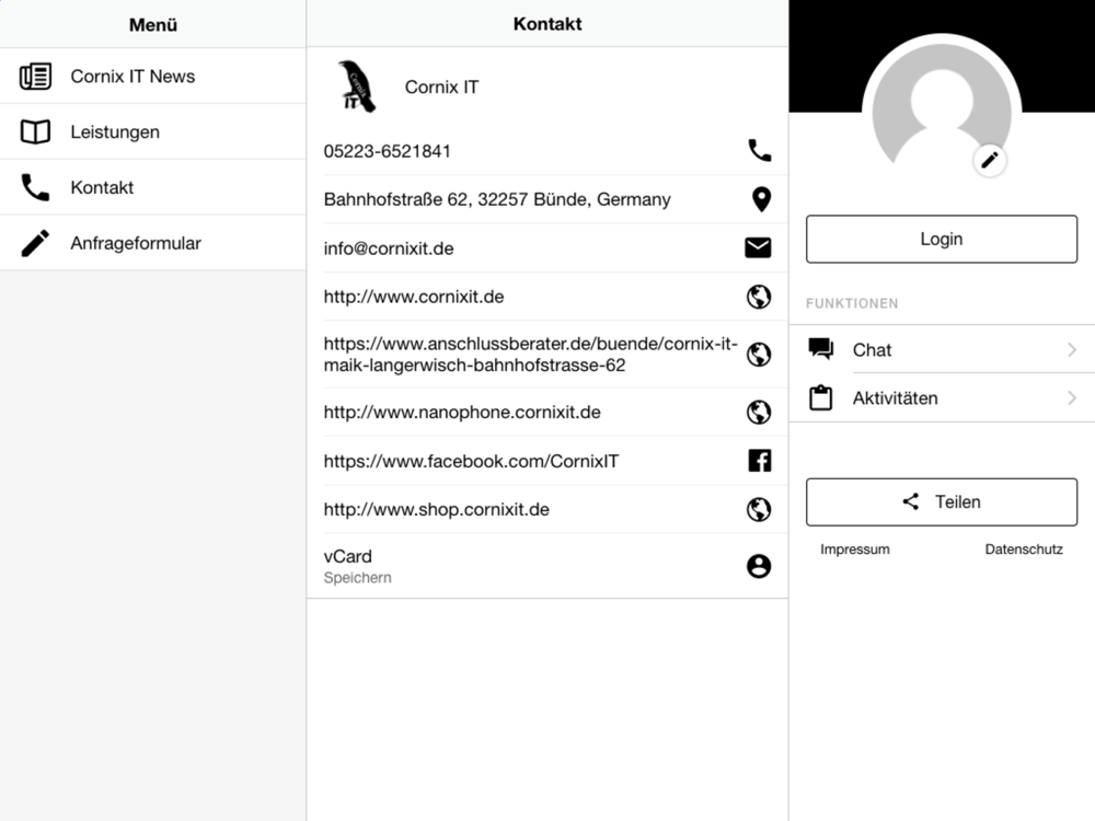 Holen Sie sich unsere offizielle Cornix IT App! Informieren Sie sich mobil über unser Unternehmen und stehen Sie immer in direktem Kontakt zu uns. Sie sind mobil - und wir sind es ab sofort für Sie auch!