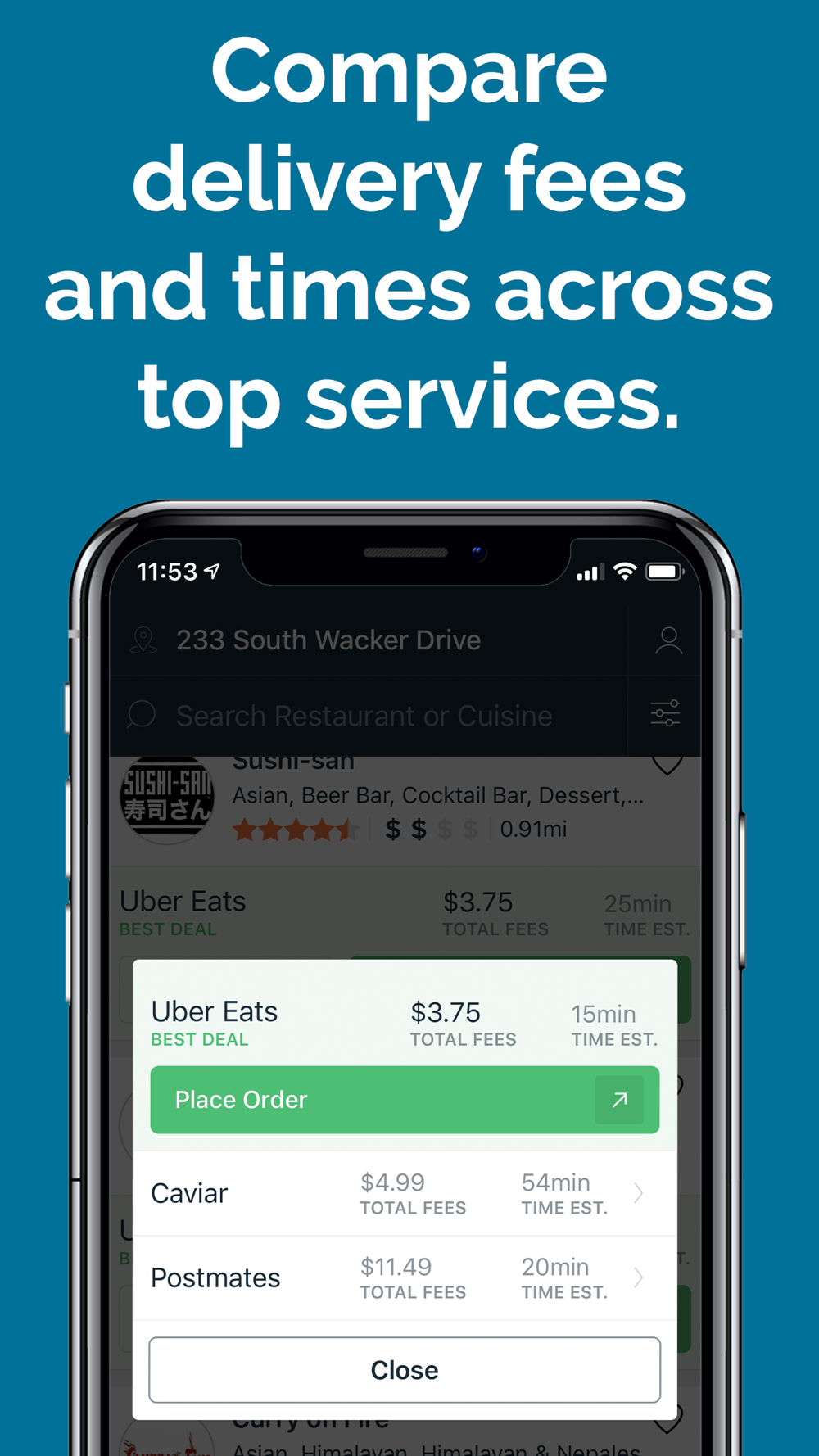 FoodBoss saves you money on food delivery by comparing real-time delivery fees from Postmates, UberEats, Caviar, and many other food delivery services, providing you with your favorite food at the lowest possible cost.