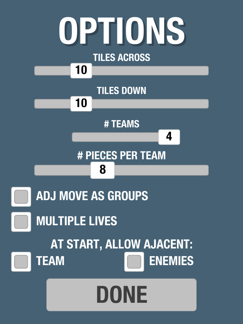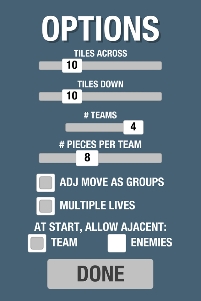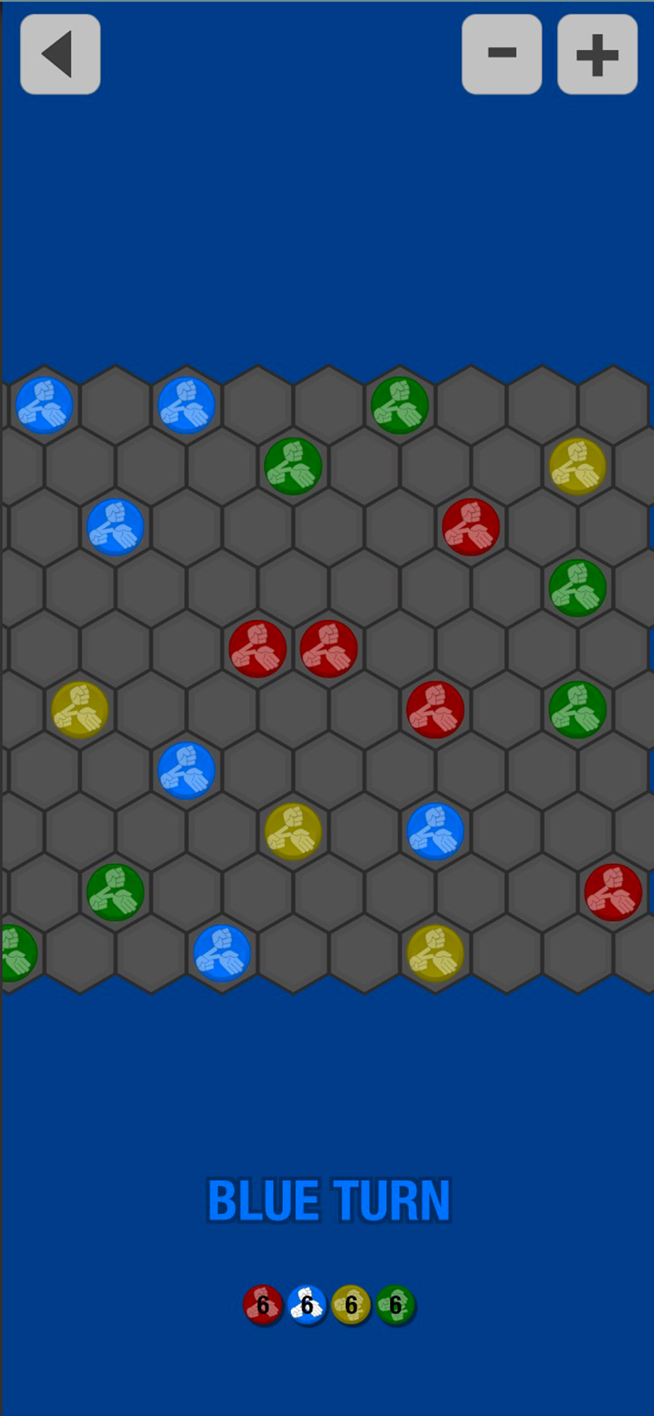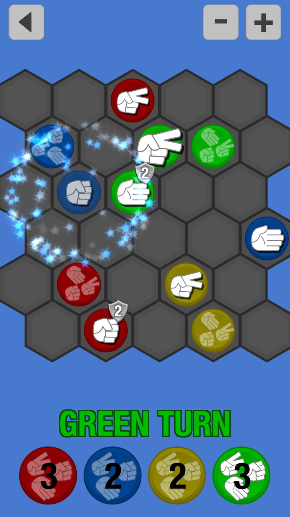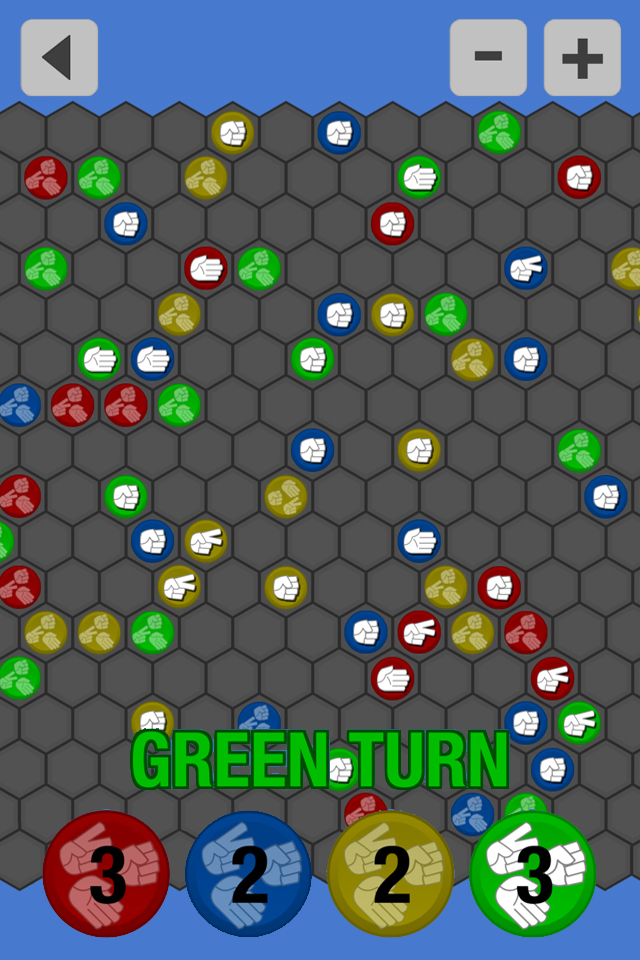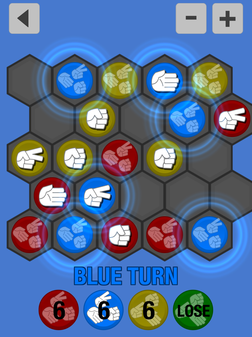 A unique board game that uses Rock/Paper/Scissors to determine battle outcomes. Pass-and-play, hex-based board game for 2 to 4 players, in which players use strategy and luck to beat their competitors. Explore countless gameplay configurations in the Options menu - from board dimensions, to multiple lives, to adjacent tiles of the same team sticking together as clusters.
