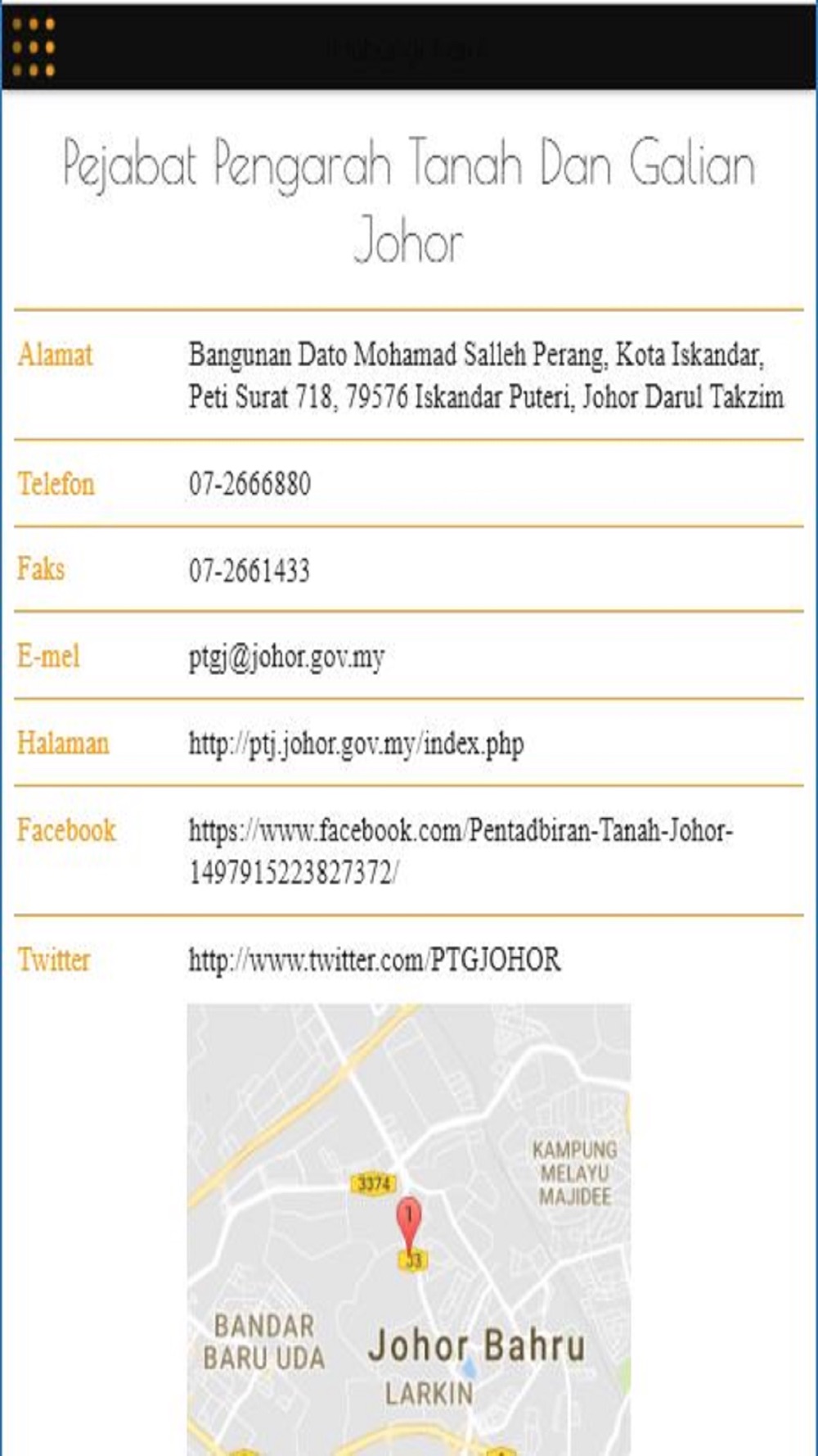 3.Cawangan - memaparkan alamat-alamat cawangan dan waktu operasi bagi memudahkan orang awam mengunjungi untuk mendapatkan perkhidmatan. Ia juga dilengkapi dengan kemudahan Google Maps