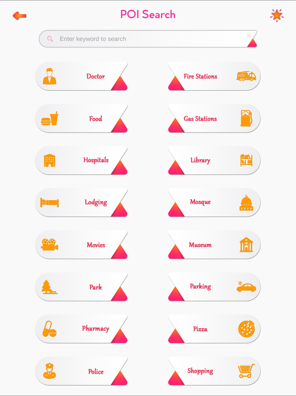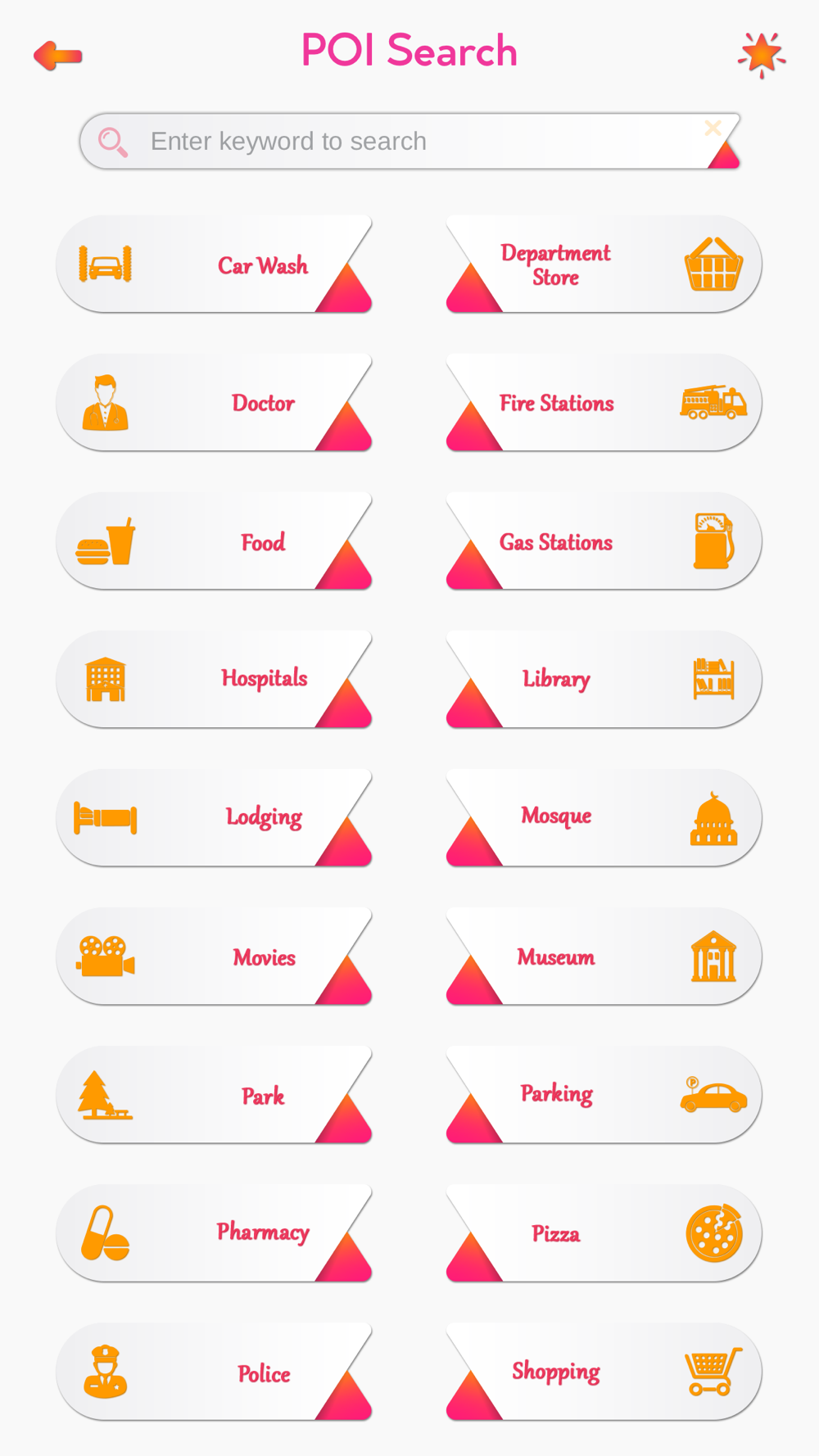 Airport, ATM, Bank, Bars, Beauty Salon, Bus Station, Cafe, Campground, Car Wash, Department Store, Doctor, Fire Station, Food, Gas Station, Hospital, Library,Lodging, Mosque, Movies, Museum, Park, Parking, Pharmacy, Pizza, Police, Shopping, Stadium, Taxi, Train Station, Travel Agency, University, Zoo.