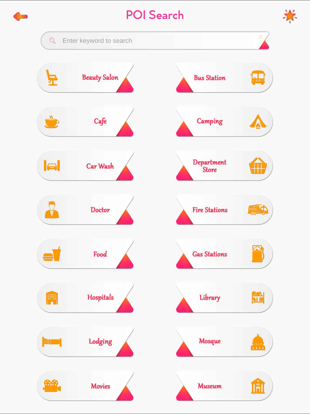 Airport, ATM, Bank, Bars, Beauty Salon, Bus Station, Cafe, Campground, Car Wash, Department Store, Doctor, Fire Station, Food, Gas Station, Hospital, Library,Lodging, Mosque, Movies, Museum, Park, Parking, Pharmacy, Pizza, Police, Shopping, Stadium, Taxi, Train Station, Travel Agency, University, Zoo.
