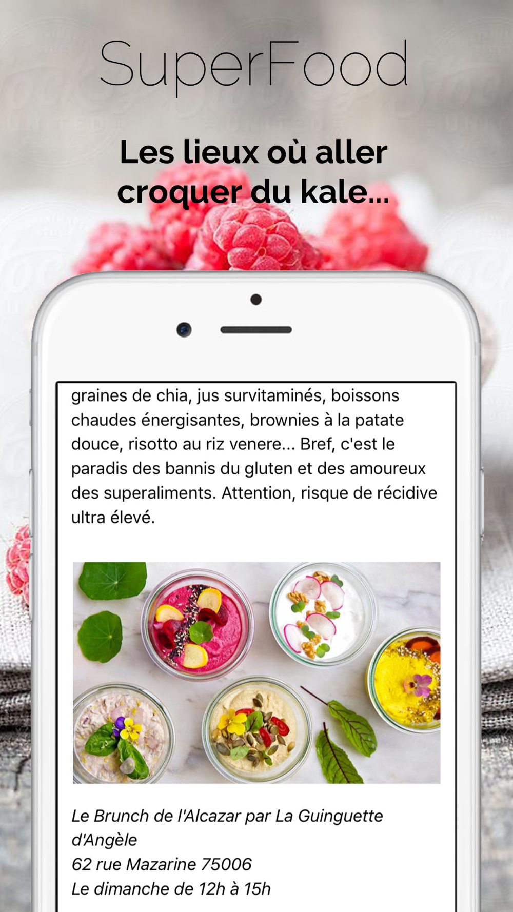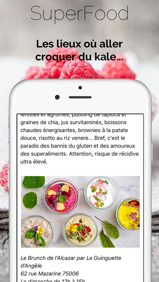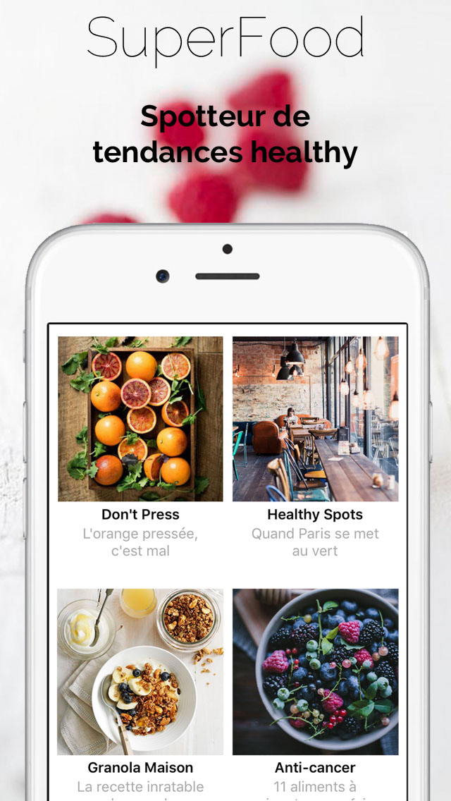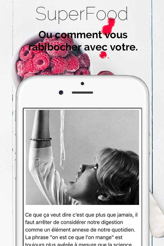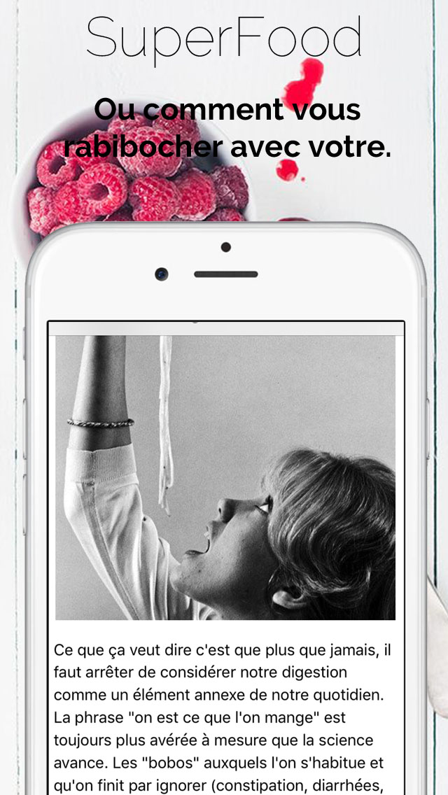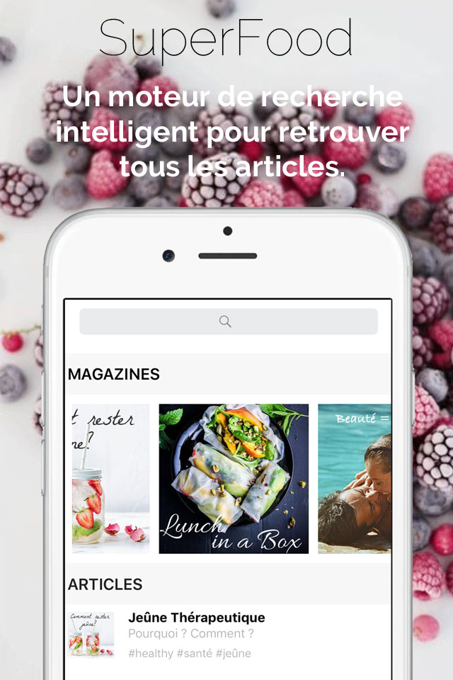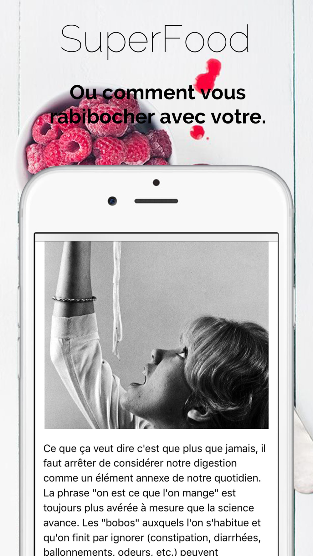 SuperFood c’est l’appli indispensable pour vous y retrouver : les baies de goji, ça sert à quoi ? Le kale, c’est vraiment bon ? Et manger de la grenade, ça protège du cancer ? Pourquoi boire un jus de citron le matin et surtout pas un jus d’orange. SuperFood répond à toutes les questions que vous vous êtes toujours posé sur l’alimentation saine et équilibrée.