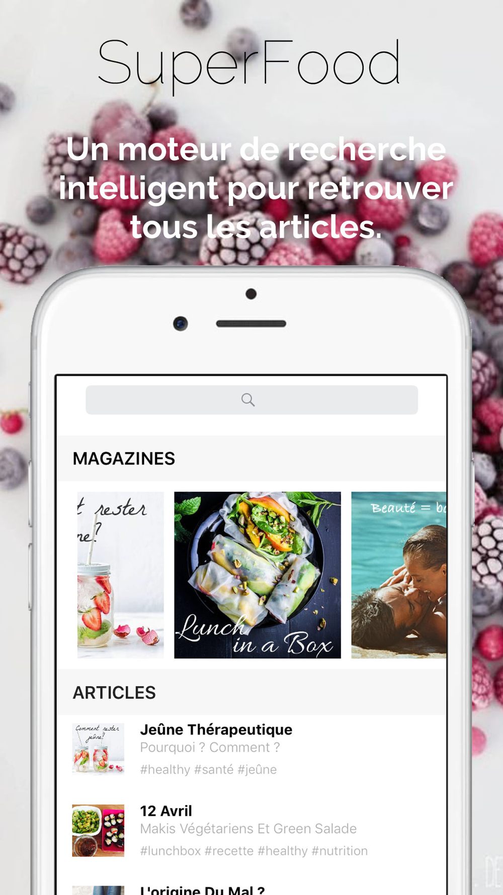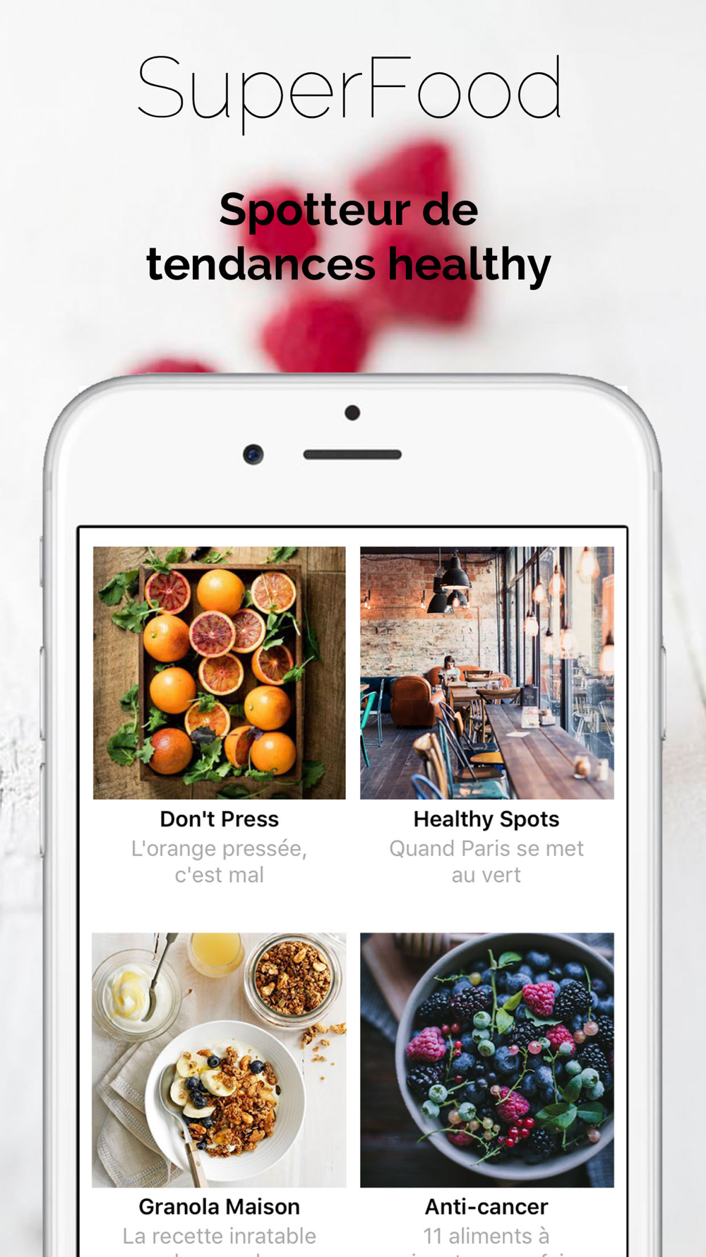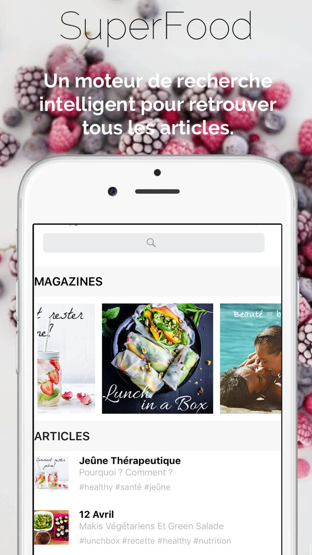 SuperFood n’a qu’un objectif, vous aider à vous sentir mieux dans votre corps en découvrant le pouvoir des super aliments. Les lieux où se mettre du healthy sous la dent, les aliments qui vous font du bien, la rencontre avec votre corps et son système digestif sont à portée de clic : téléchargez SuperFood pour enfin réaliser le rééquilibrage alimentaire qui va vous aider à vivre mieux, plus longtemps et en bonne santé.