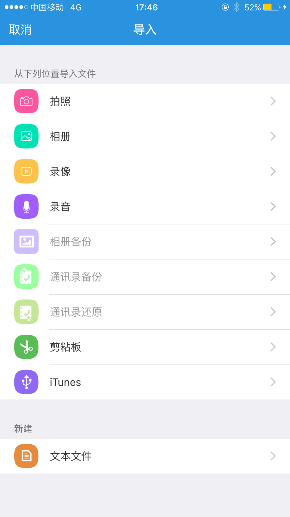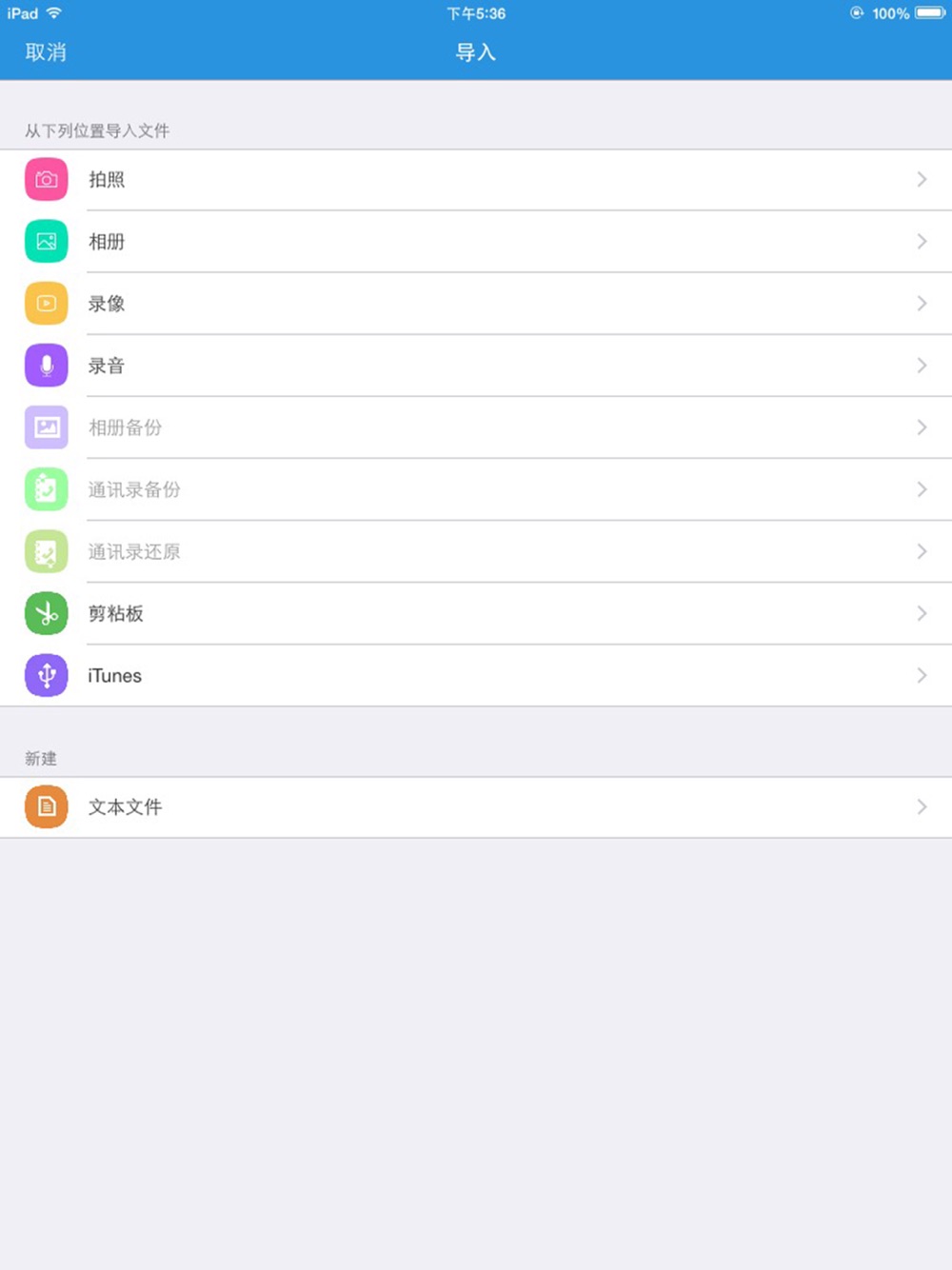 由相册导入图片和拍摄的短片,或通过itunes导入文件,保存至手机本地进行集中安全管理,支持单个或多个文件的复制、删除、移动等常用操作;连接iPhone、平板电脑等移动设备(需软硬件支持OTG功能),这样即可实现PC、MAC、PDA、iPhone等设备间的数据共享。