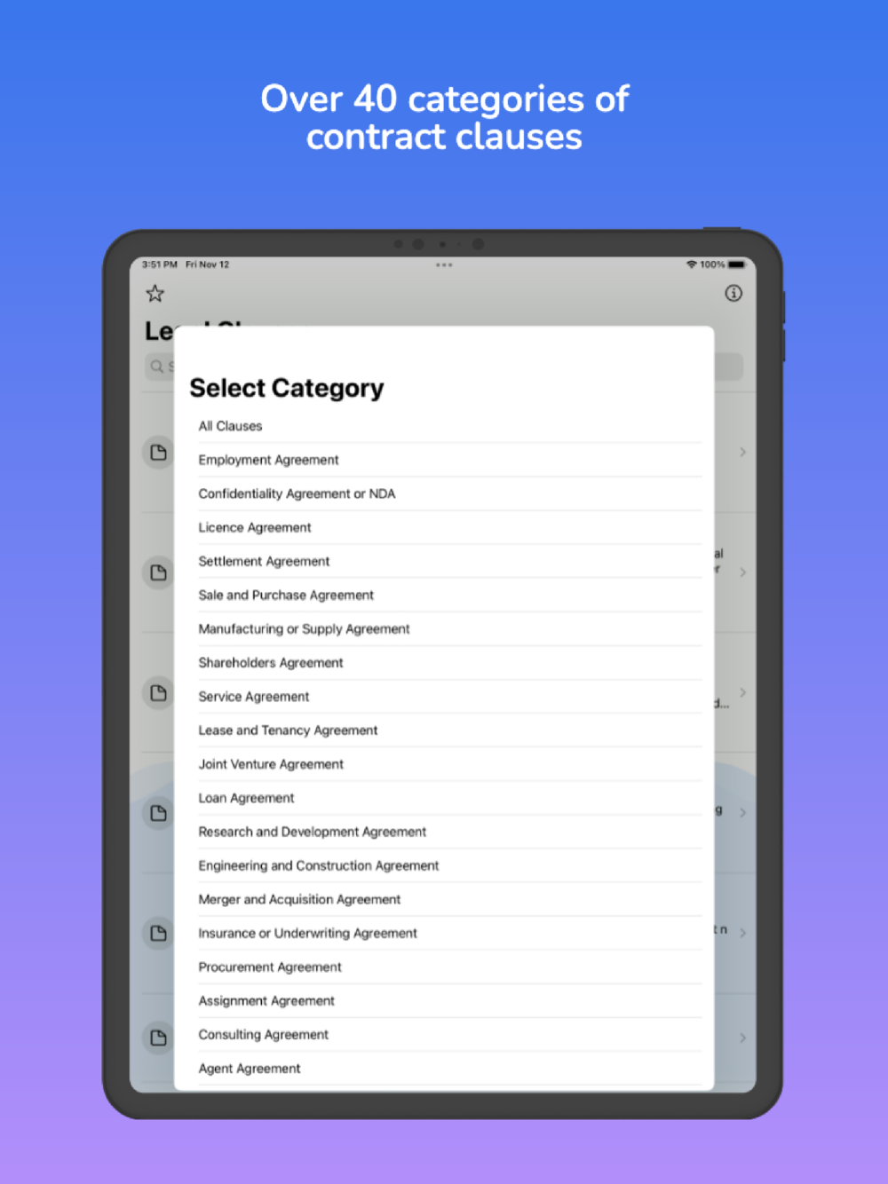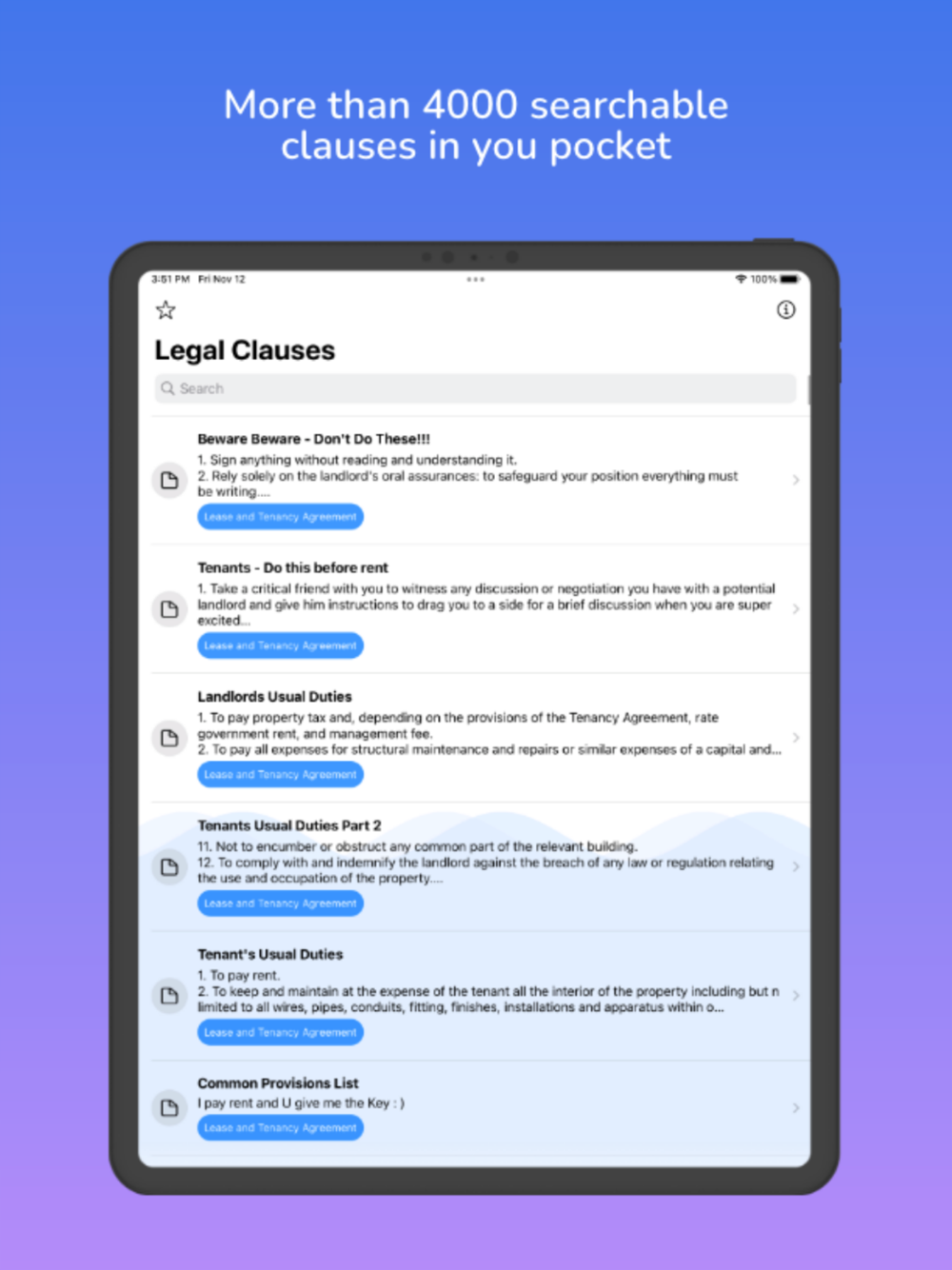 Each clause is professionally selected and categorized. It is an ever growing library. You can search, save to favorite, copy to clipboard and share the clauses. It is all FREE! Keep Legal Agreement Clause in your mobile, and let us help you find a handy clause for all the important contracts. Why do we do it? Because we, Dennings, aim to use information technology to simplify advisories! If you want to contribute to Legal Agreement Clause and make legal advisory approachable to all, share our app and feel free to contact us at