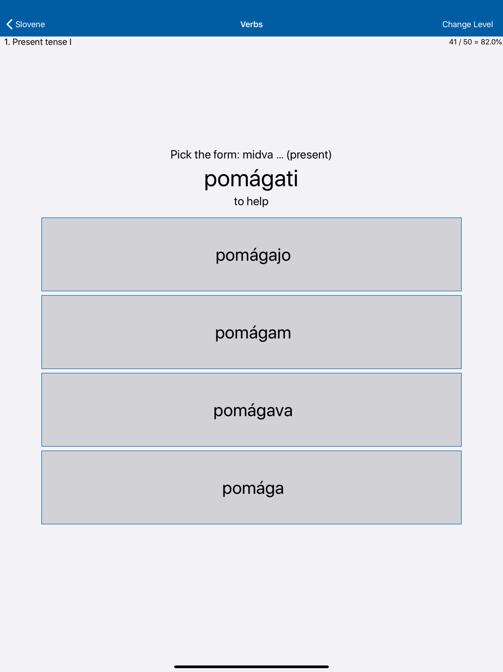 Wherever you have your phone and a free moment, it offers a continuous multiple-choice test on Slovene vocabulary, the declension of nouns, and the conjugation of verbs. Each answer you give is immediately confirmed or corrected, and your knowledge is reinforced by repetition.