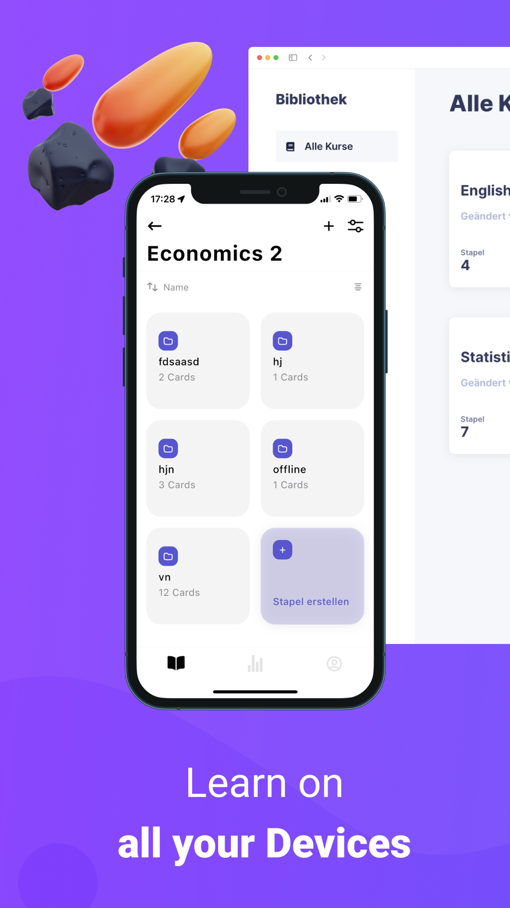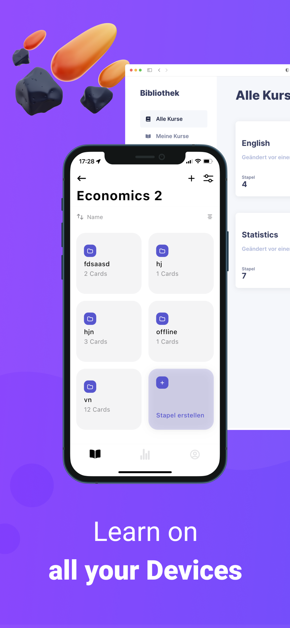 You can create flashcards and multiple choice questions on all devices and they will be synced automatically. Our card format gives you all the freedom you know from other programs. Add unlimited images to your flashcards, highlight important parts in color, and always get appealing flashcards. In the web app, you can also import content, such as vocabulary lists from a CSV file. You want to restructure your courses? No problem, in the WebApp you can copy or move entire card stacks or individual cards.