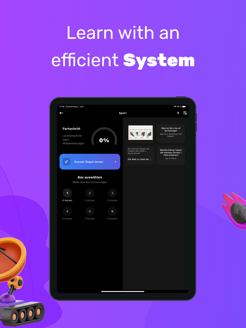 Improve your vocabulary and learn words with Buffl. Add a picture and make your flashcards even more vivid. With multiple-choice cards you can also test your grammar and comprehension. Tip: In the web app, there is a list view in the editor, which is especially good for quickly entering a lot of vocabulary. If you already have a vocabulary list, you can simply import it.