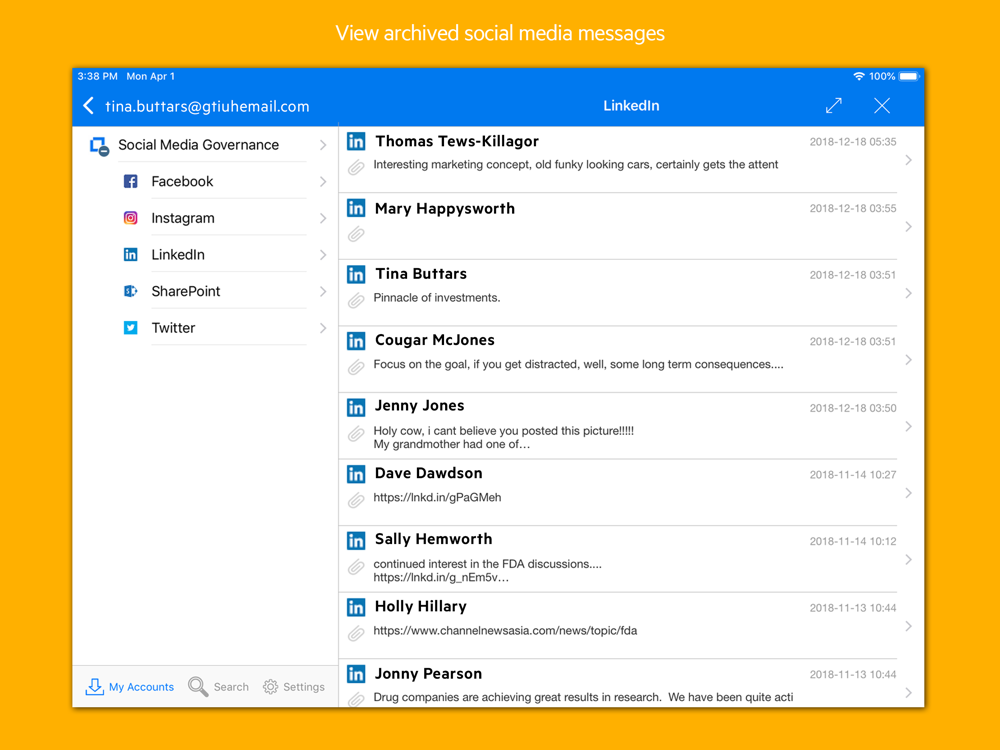 • View archive social media messages from WhatsApp, WeChat, LinkedIn, Twitter, Facebook, SharePoint, and Instagram