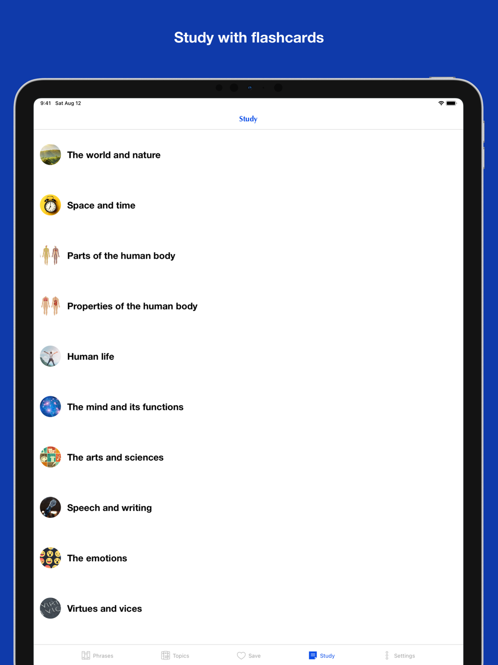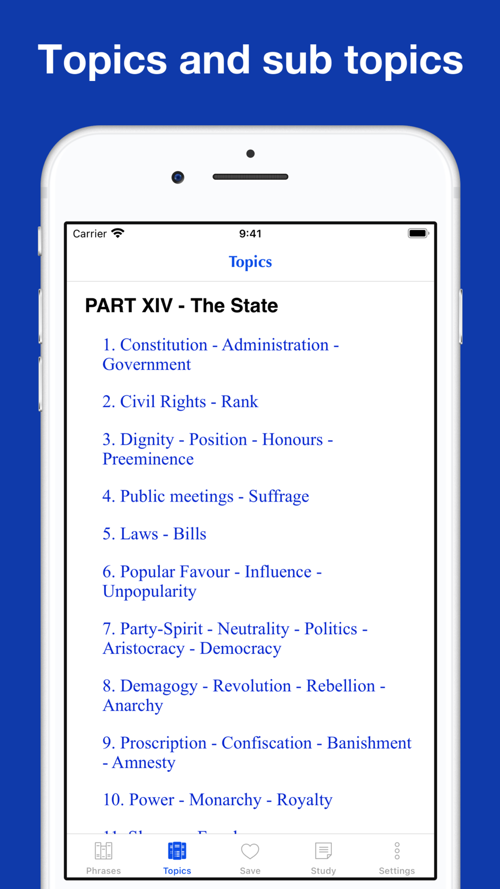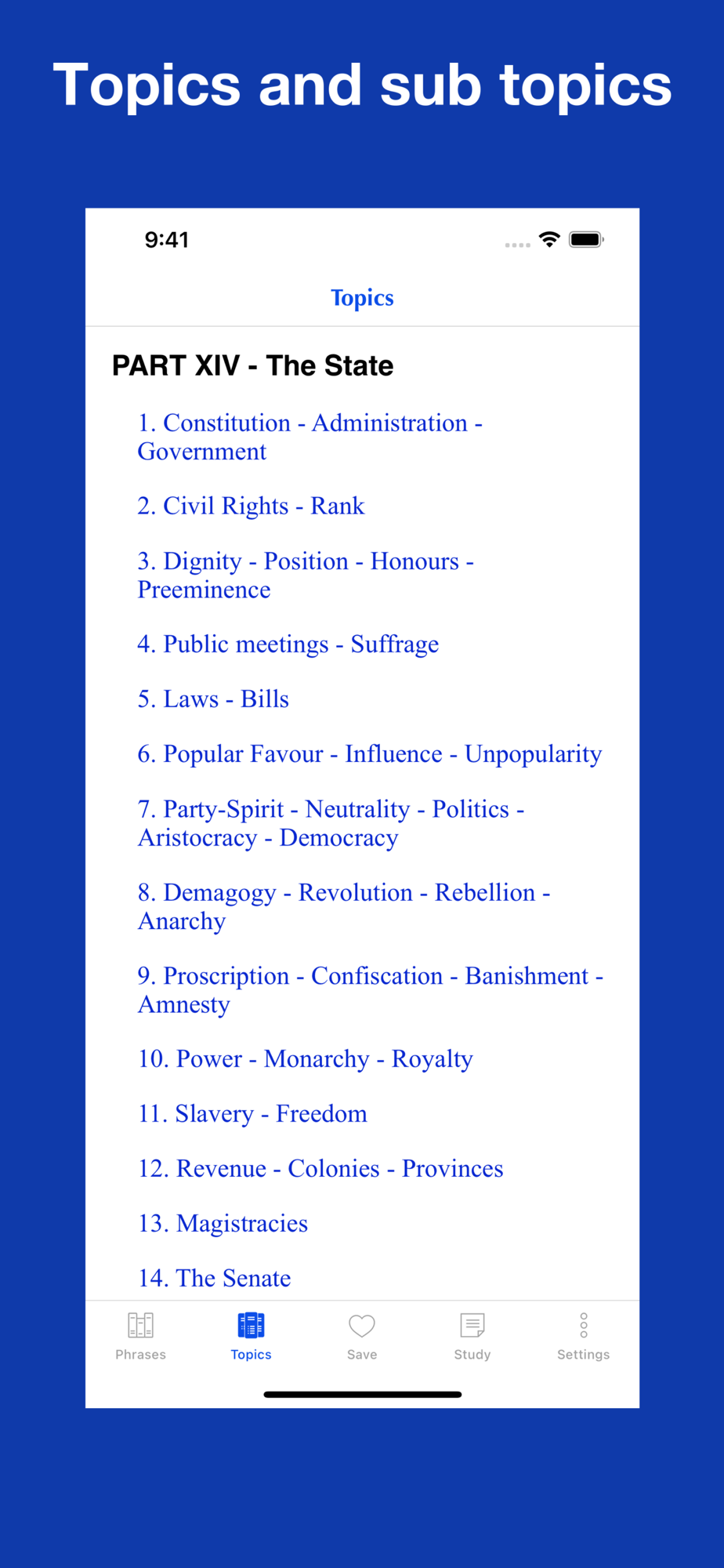 • 17 topics: the world and nature, space and time, parts of the human body, Properties of the human body, Human life, the mind, the arts and sciences, speech and writing, the emotions, virtues and vices, religion, domestic life, commerce and agriculture, the state, law and justice, war, shipping, appendix.