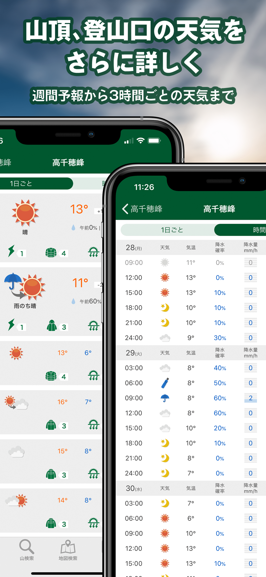 ●山の1時間ごとの天気がわかる