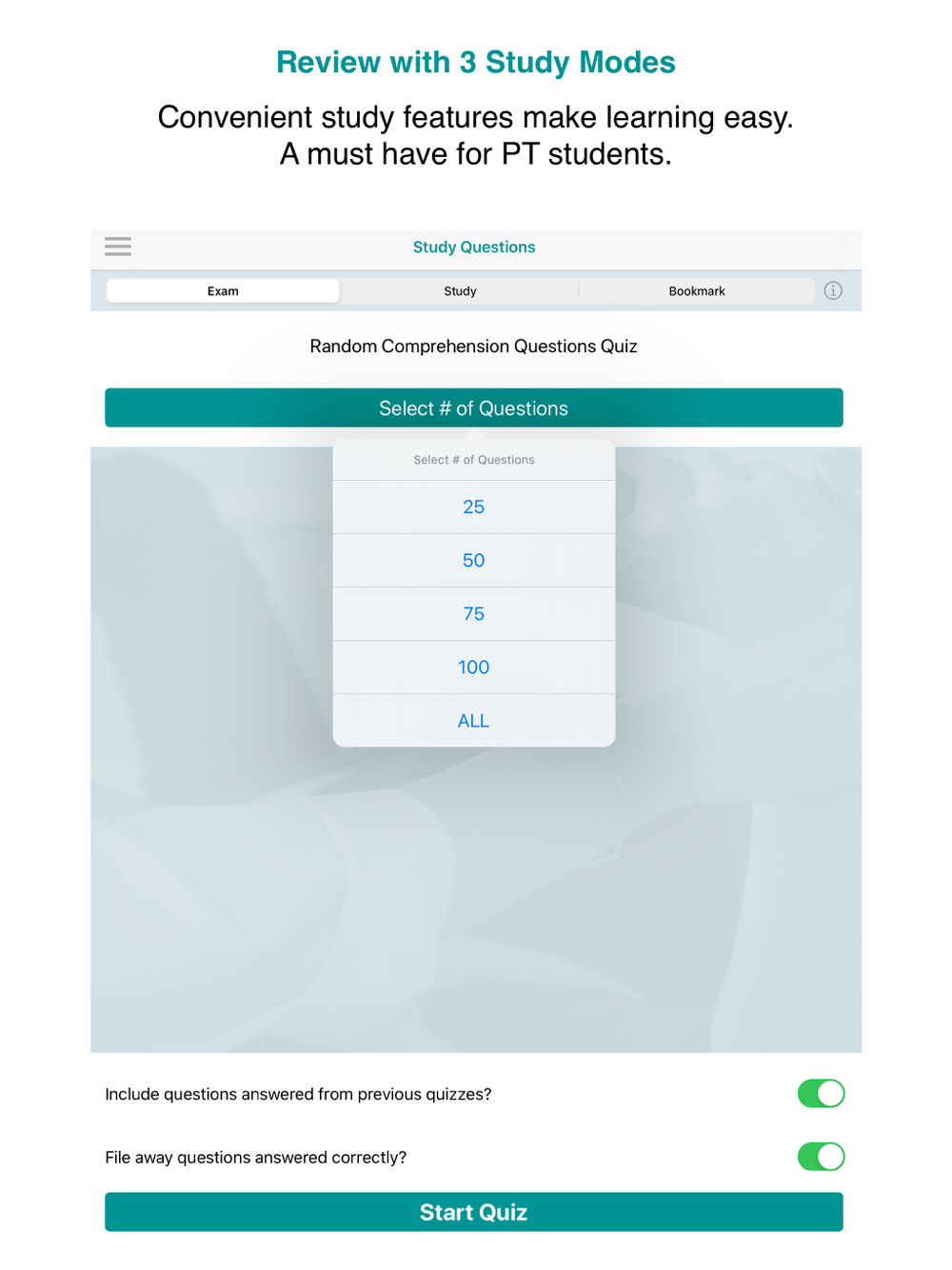 -Choose the number of questions in each practice quiz: 25, 50, 75, 100, 150, or all.