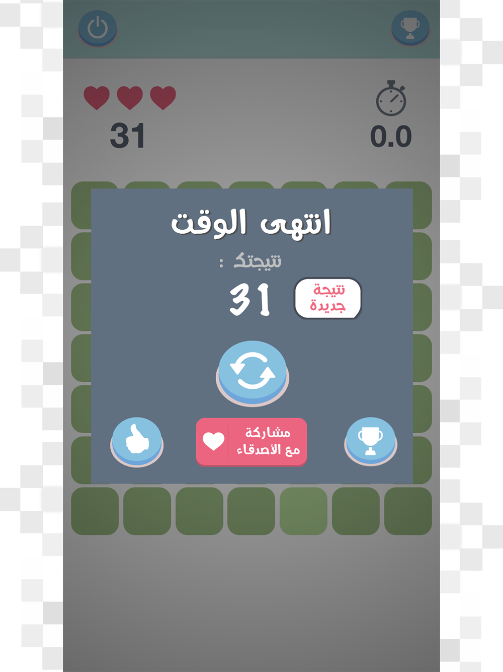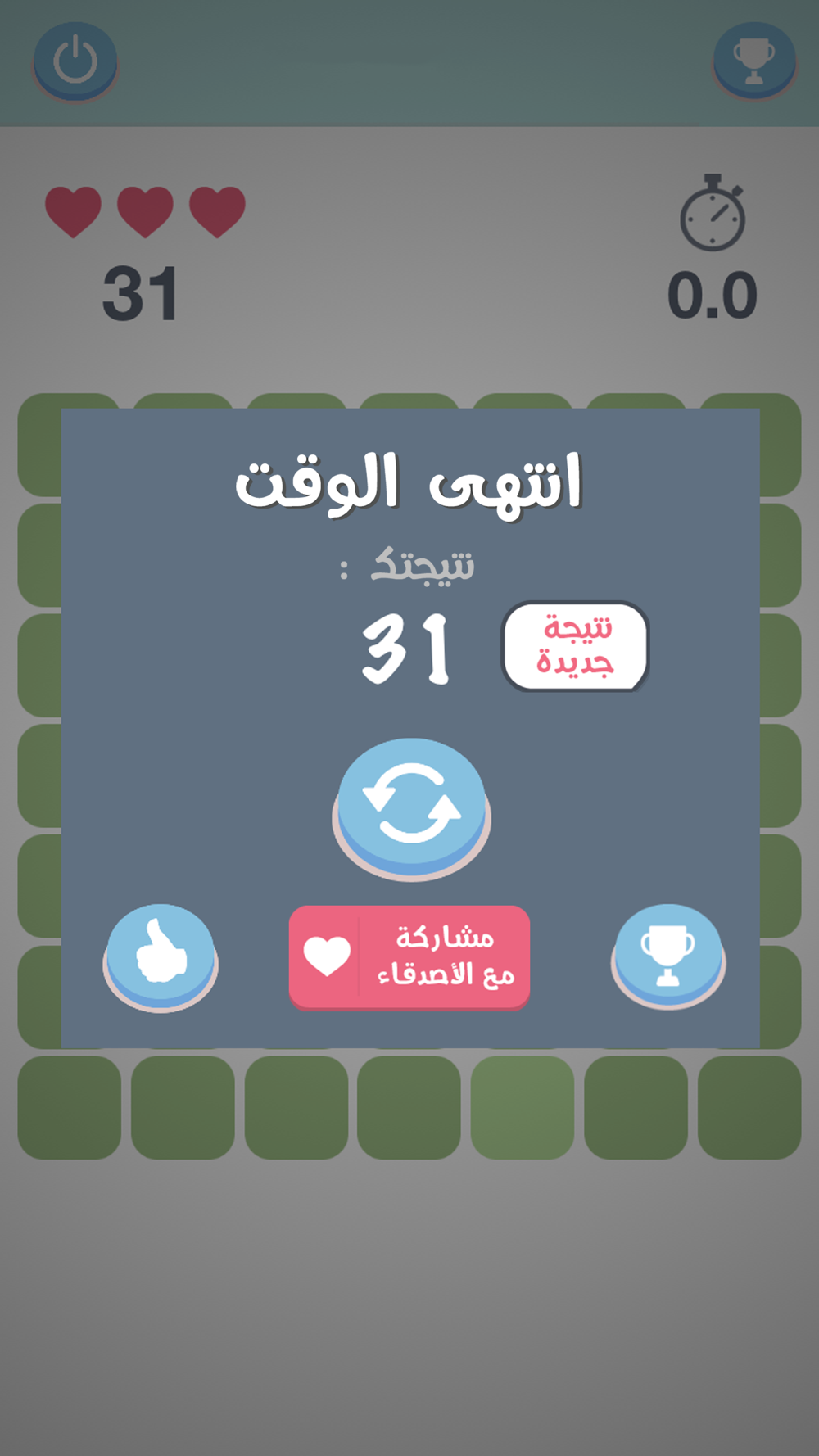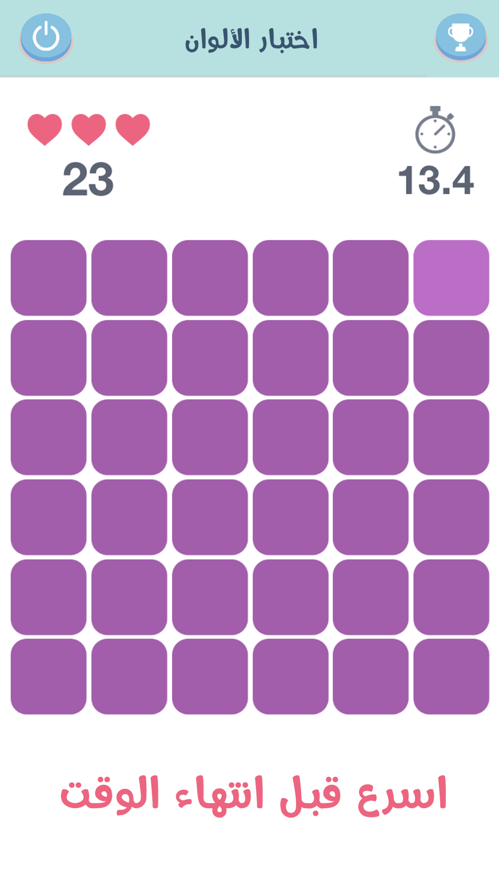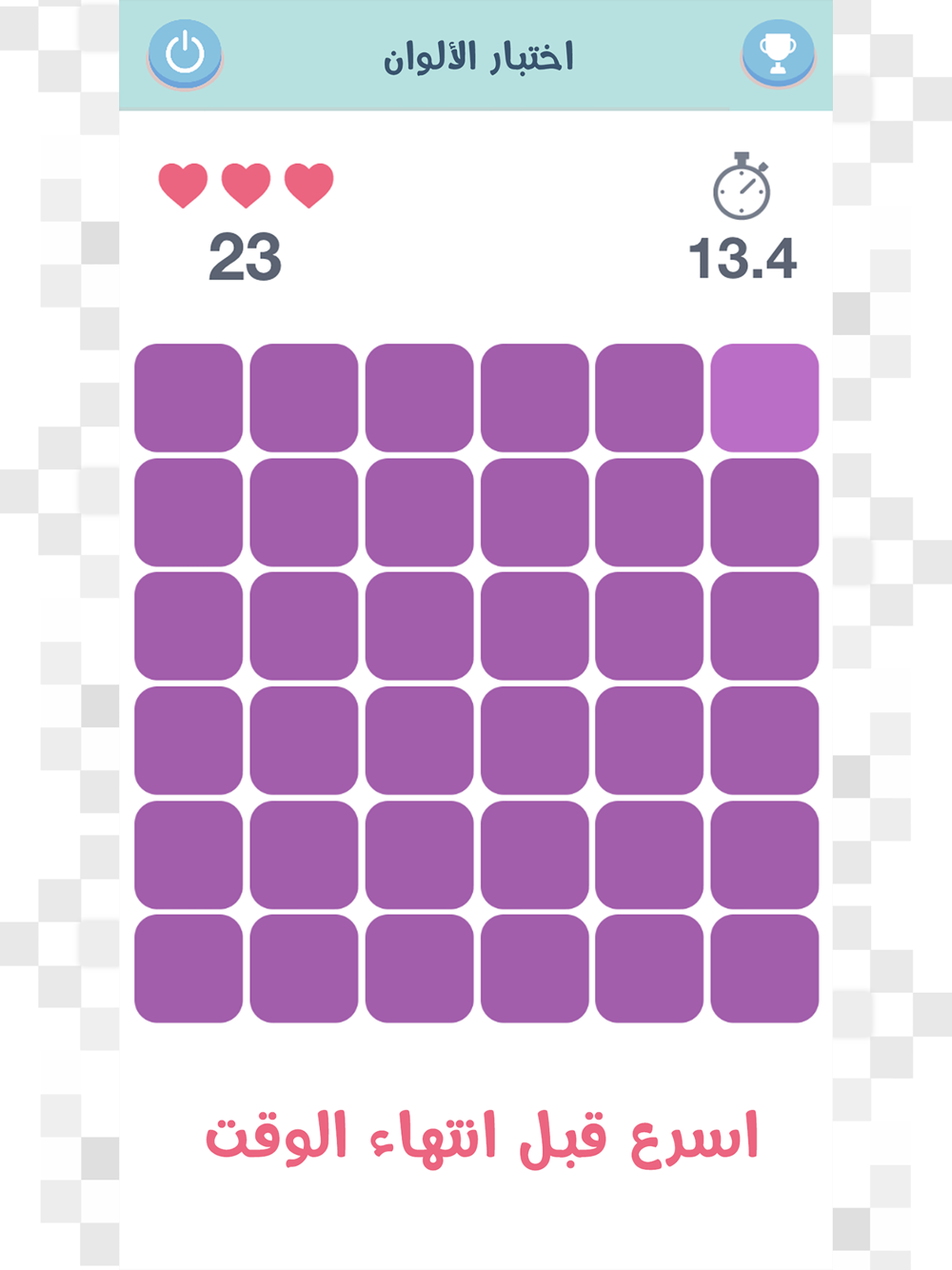لعبة عربية بسيطة من خلالها يمكنك اختبار قوة تركيزك وقوة النظر , تتكون اللعبة من واجهة مليئة بالمربعات ذات اللون نفسه ومن ضمنها مربع واحد فقط يكون لونه اقل درجة وانت عليك ان تركز وان تختار هذا اللون ان وجدته , وحاول ان تسرع لان اللعبة تحتوي على مؤقت فكلما اسرعت كلما احرزت نقاط اكثر !