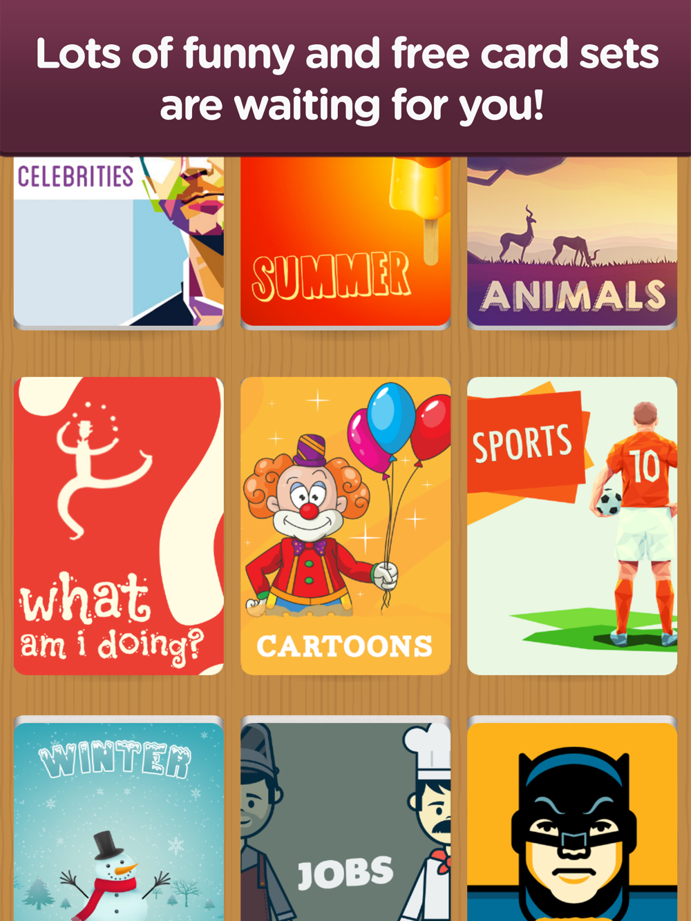 Animals words card, Celebrities cards, Cities cards, Jobs cards, Kitchen cards, Musicians charades, Sports charades, Summer, Super Heroes, What Am I Doing?, Winter, TV Shows, Movies, Cartoons