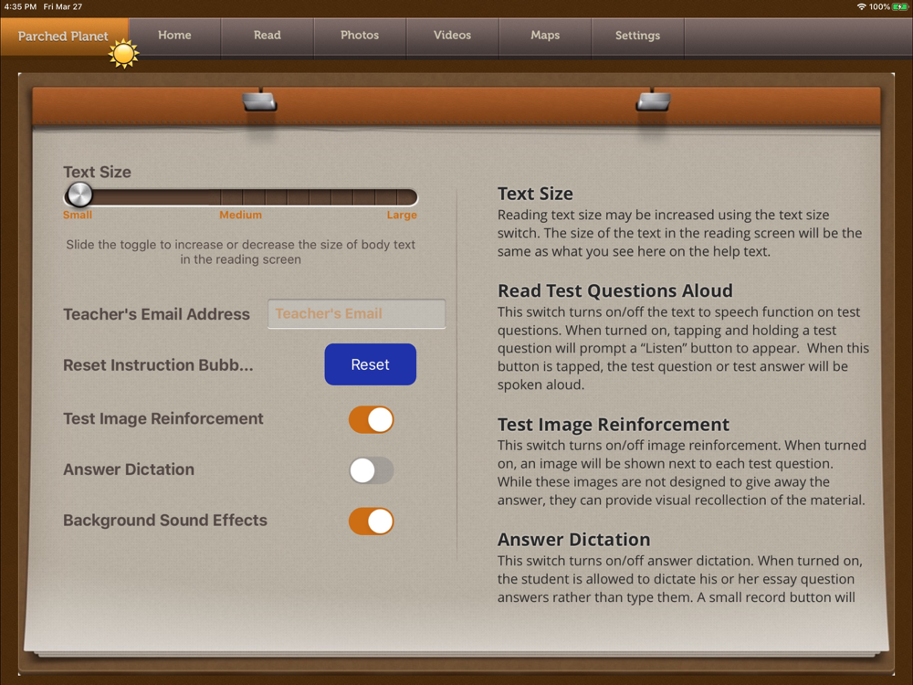 For students with special needs, there are additional settings for common classroom and assessment accommodations including text to speech, answer dictation, image reinforcement and text zooming.