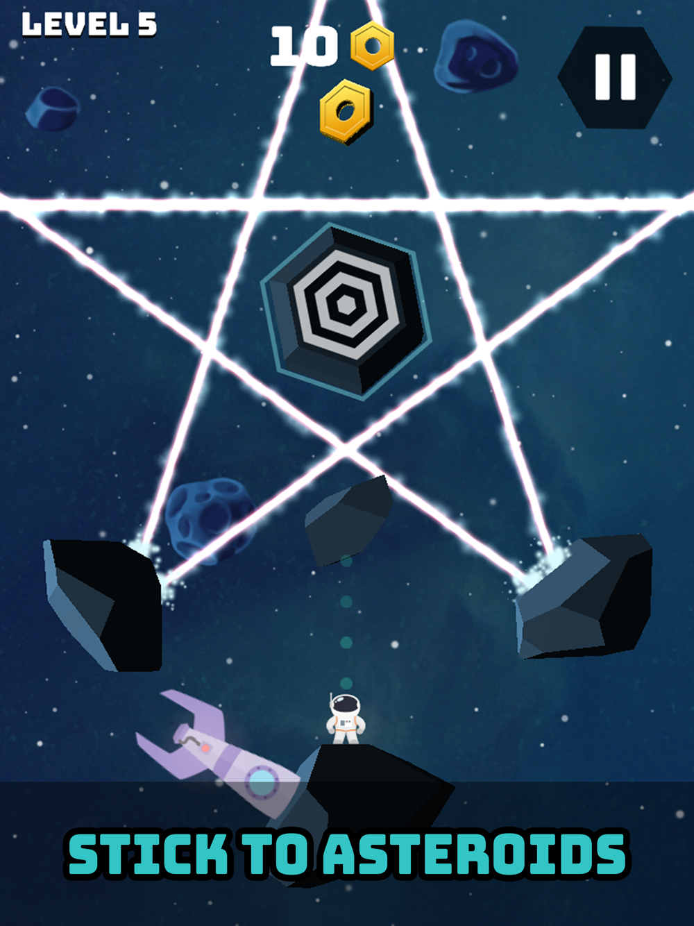 Tap to jump off one asteroid and drift through space to land on the next. Avoid the laser beams and proximity mines surrounding you.