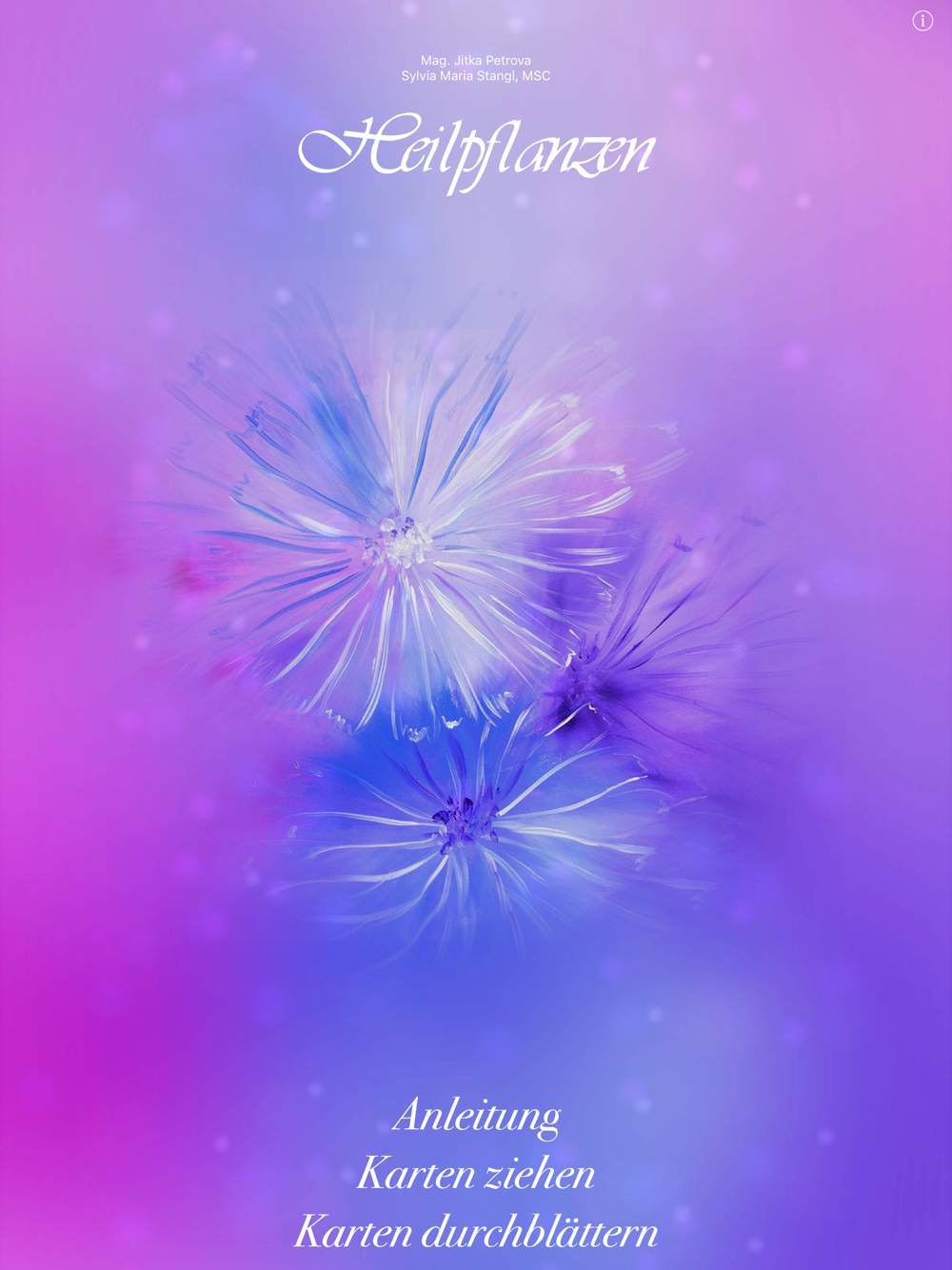 Dieses liebevoll gestaltete Heilpflanzen App beinhaltet 75 Heilpflanzen Karten mit Botschaften, welche vom Geist der Pflanzen übermittelt wurde. Der Heilige Spirit wirkt durch die gemalten Bilder. Diese strahlen die Heilende Schwingung der Pflanzen aus und sind direkt von Pflanzen Devas inspiriert und gesegnet.