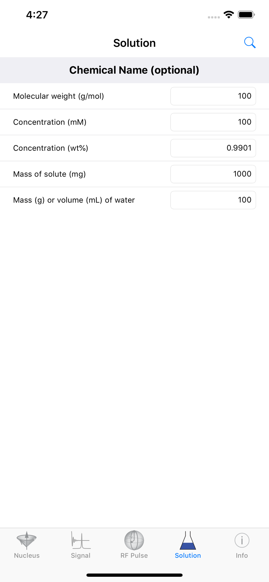 The app evaluates the values of some basic parameters used in nuclear magnetic resonance (NMR) spectroscopy.