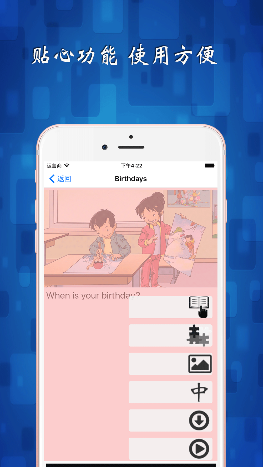 课文:全新展现课本内容,图片和文字语音同步,支持多种模式播放点读,同步教材编排,从此不用点读机;