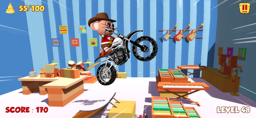 Moto Mouse Mania is a fun adventure and action racing game with cute little kid mouse with different bikes and nice animation. Not all Mice should be hated and after all this one is a cute and loveable. Now it's your job to look after it and make sure it gets its cheese on the way. Complete multiple levels and play with the danger as the mice do all the time.Be careful this might not be so easy but a challenge and risk worth taking! Good luck!