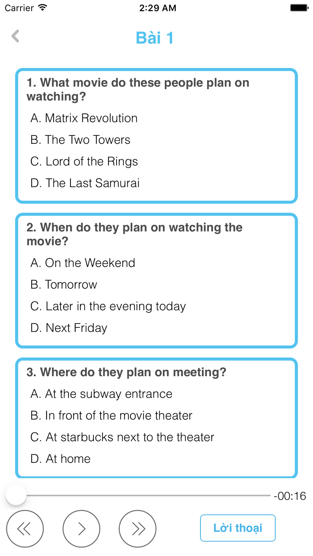 - Trong mỗi bài học đều có phần bài tập về nội dung bạn vừa nghe để giúp bạn kiểm tra lại kĩ năng của mình sau mỗi bài học.
