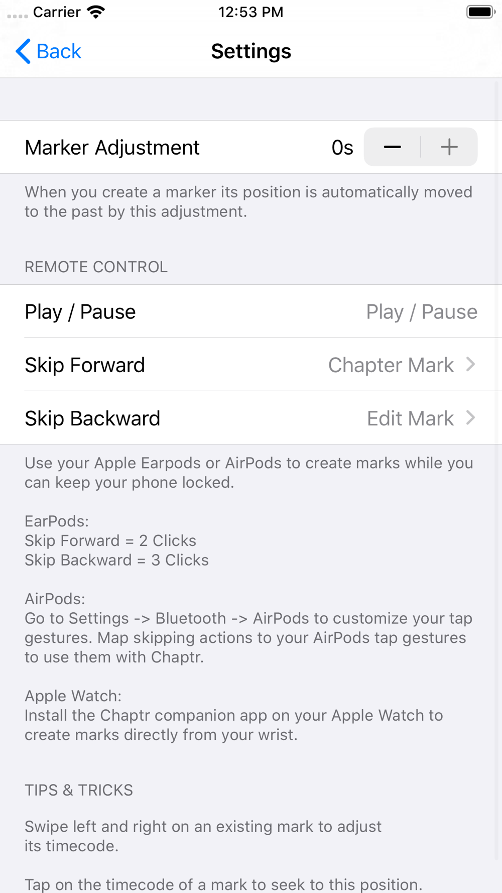 Add marks while listening: Click two or three times with your Apple EarPods to add marks while your iPhone is locked. You can also configure your AirPods to work with Chaptr.