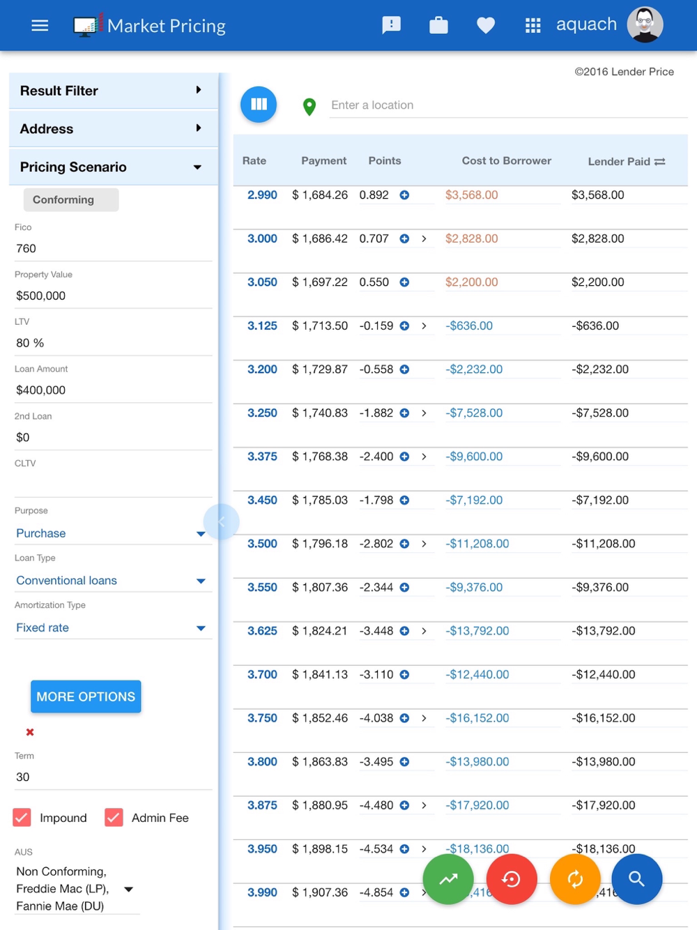 Lender Price mobile is a mortgage pricing engine used by mortgage professionals to search thousands of mortgage products, rates, pricing, and loan level eligibility. Lender Price provides an open accessible marketplace of lenders and banks to place their mortgage programs and products and allows loan originations (e.g. loan officers) to find the best loan program and interest rate for their borrowers. Lender Price mobile is full featured and a wonderful extension of our cloud based application used by many of the top banks and non-bank lenders in the nation.