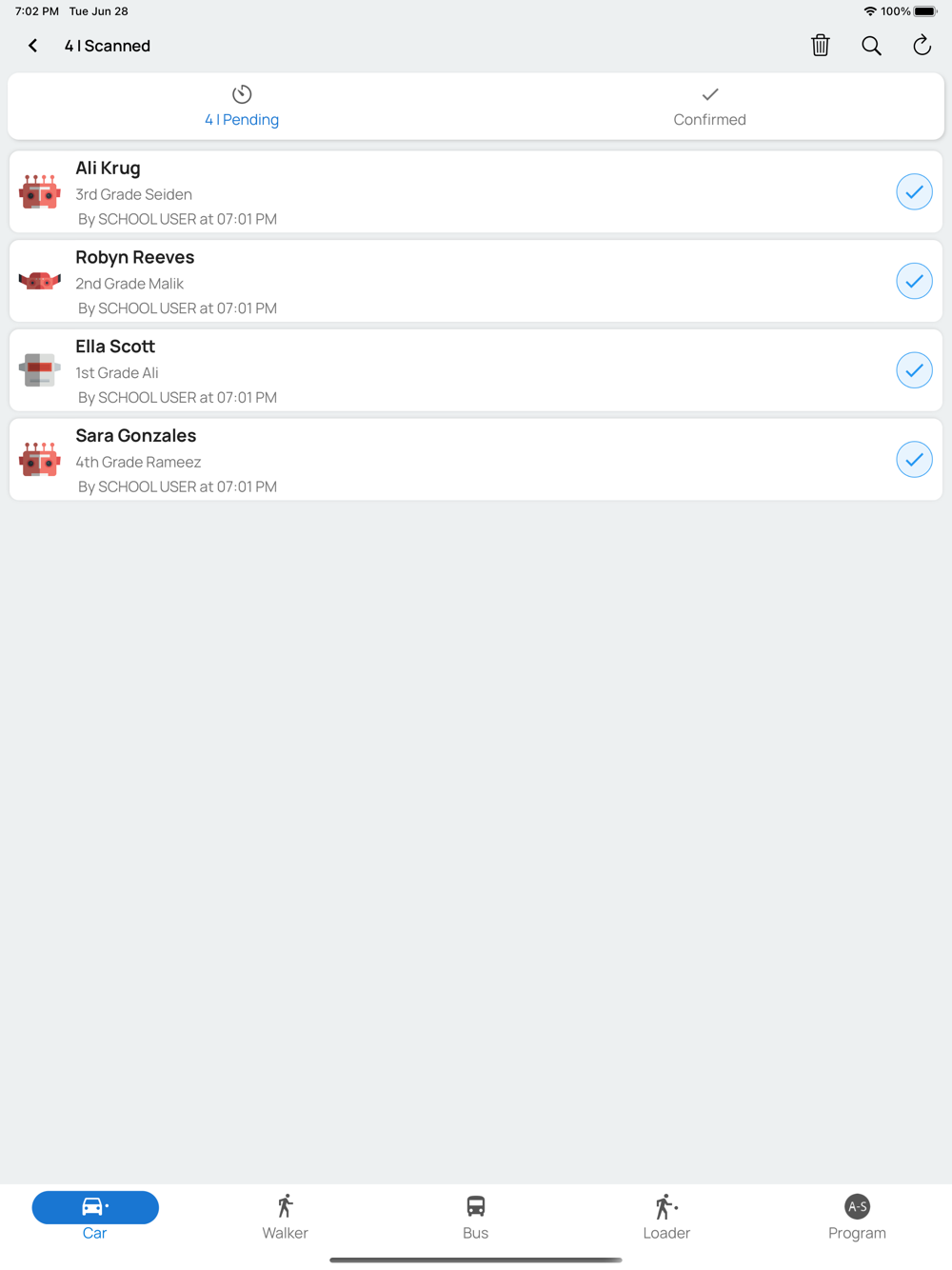 • DISMISS STUDENTS: Scan QR codes or unique ID tags to queue students up for release from the classroom.